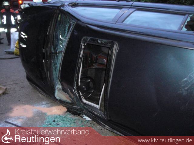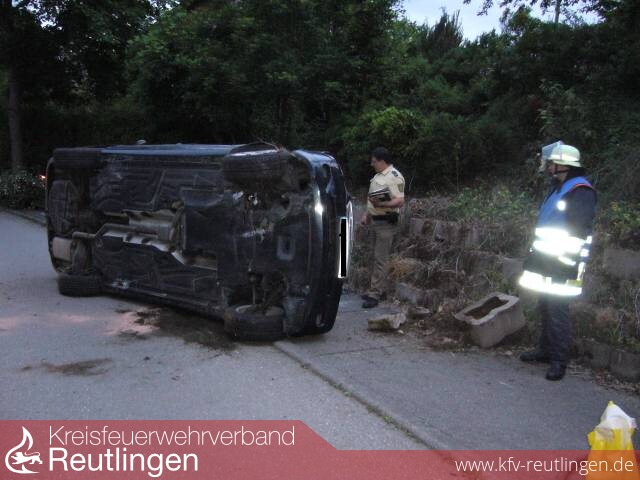 Im Wohngebiet, fuhr ein Fahrzeug aus einem Privatgrundstück einen Böschung hinunter, überschlug sich um blieb dann auf der Straße „Im Wiesental" auf der Fahrerseite liegen. Der Fahrer wurde wurde nur leicht verletzt und konnte sich selbst aus dem Fahrzeug befreien
