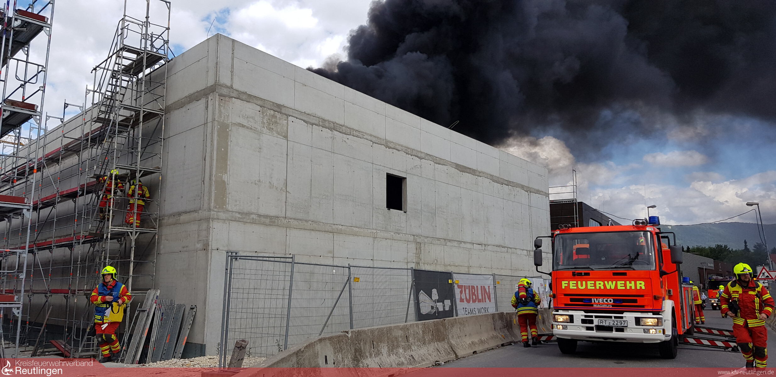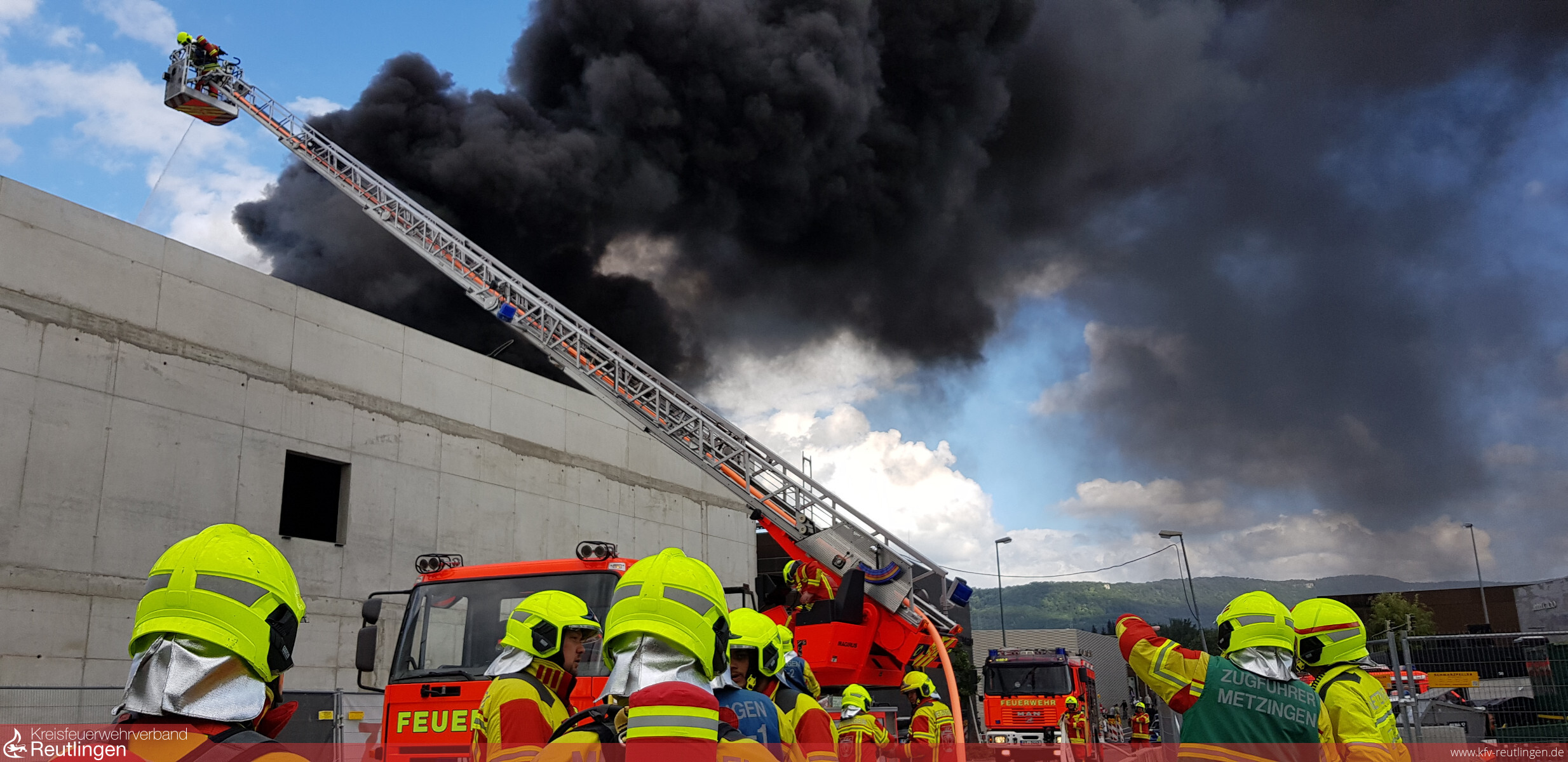 Zu einer unklaren Brandmeldung wurde die Feuerwehr Metzingen am Freitagnachmittag in die Christian-Völter-Straße zur dortigen Großbaustelle G+V Areal alarmiert. Der diensthabende B-Dienst gab eine Minute nach Alarmeingang Lage auf Sicht und bestätigte eine starke Rauchentwicklung auf dem Dach eines zweistöckigen Rohbaus.