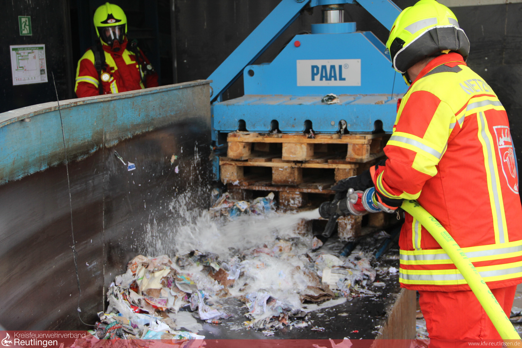 Als die Feuerwehr wenige Minuten später am Einsatzort eingetroffen war, drang bereits dichter Rauch aus der mehrere Hundert Quadratmeter großen Sortierhalle. Weil alle Beschäftigten bereits im Freien waren, konnte sich die Feuerwehr auf die Brandbekämpfung konzentrieren. Wie sich herausstellte, war es in einer Papier-Großpresse zum Brand gekommen. Mit zwei Rohren löschten die Einsatzkräfte das Feuer. Parallel dazu erfolgte die Belüftung der Halle. Der alarmierte Rettungsdienst überprüfte die Beschäftigten in der Sortierhalle. Verletzte gab es jedoch nicht zu beklagen.