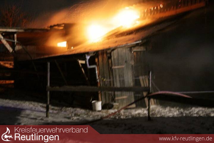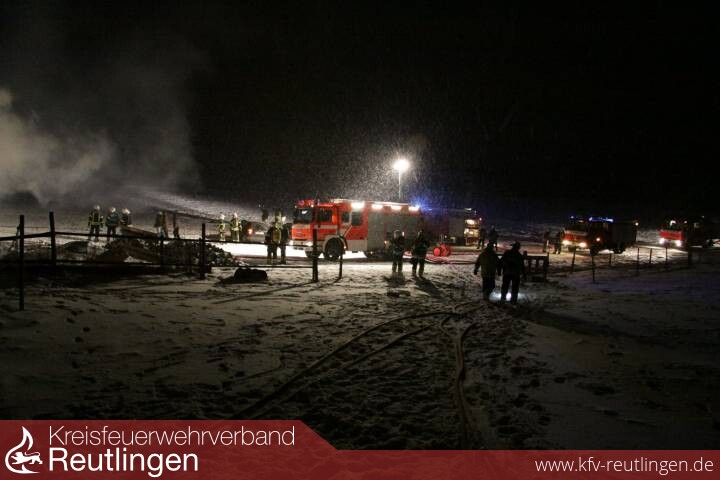 Die Feuerwehr Reutlingen wurde am Donnerstagabend um 20:30 Uhr zu einem Scheunenbrand nach Bronnweiler gerufen. Aus noch ungeklärter Ursache kam es zum Brand einer Feldscheune mit Offenstallung.