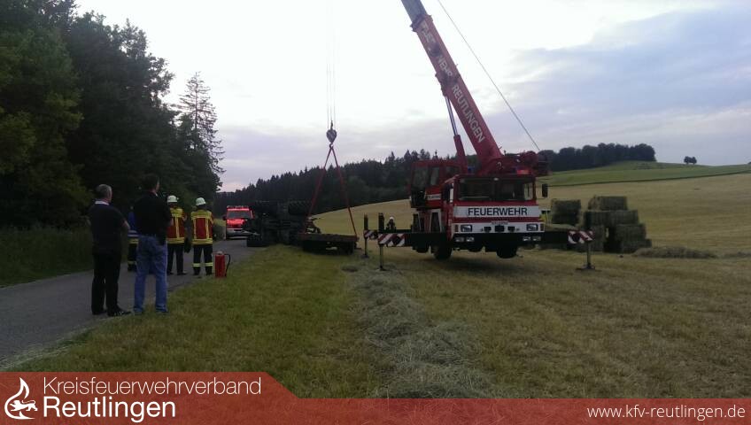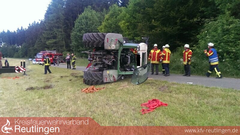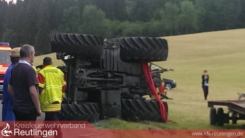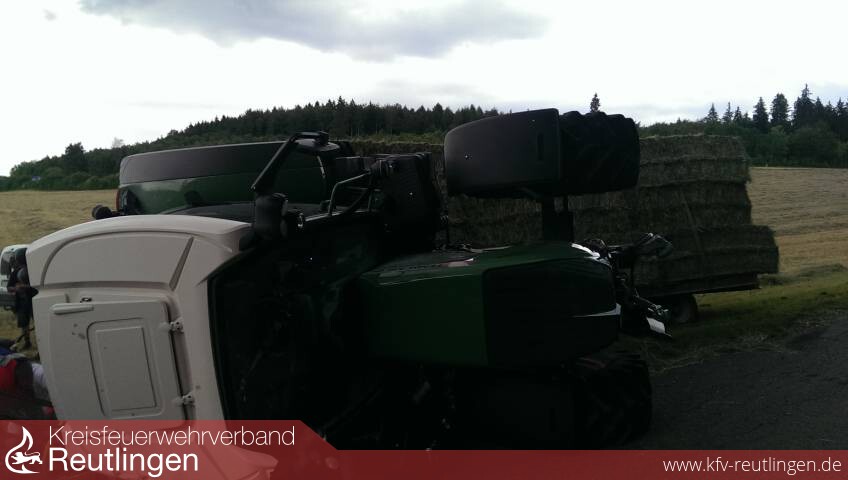 Am Dienstag, um kurz vor 17 Uhr, kam es auf dem Gemeindeverbindungsweg zwischen der K 6734 (Bernloch-Gomadingen) und der L 230 (bei Kohlstetten) zu einem schweren Verkehrsunfall, bei welchem ein 45 Jahre alter Traktorfahrer lebensgefährlich verletzt wurde. Der Mann führte seine Zugmaschine Fendt und einen Anhänger mit 18 Rundballen in Richtung Kohlstetten, als ihm auf der abschüssigen schmalen Strecke ein Pkw Mercedes-Benz ordnungsgemäß entgegenkam. Als der Traktorfahrer abrupt bremste und nach rechts lenkte, versagte die Anhängerbremse. Die Zugmaschine wurde quer zur Fahrbahn getrieben, kippte um und wurde noch weitere Meter in Fahrtrichtung geschoben. Dabei berührten sich der Traktor und der Pkw. Der Fahrer des Traktors wurde beim Umkippen aus der Kabine geschleudert und geriet teilweise unter das Zugfahrzeug. Der 45-Jährige erlitt dadurch lebensgefährliche Verletzungen und wurde nach einer erfolgreichen Reanimation durch den Rettungsdienst ins Krankenhaus gebracht. Der 28 Jahre alte Autofahrer wurde durch umherfliegende Splitter leicht verletzt. Bei der Unfallaufnahme wurde festgestellt, dass der manuell verstellbare Bremskraftregler am Tieflader außer Funktion gestellt war und der Traktorfahrer nicht im Besitz einer erforderlichen Fahrerlaubnis für diese Fahrzeugkombination ist. Die Polizei ermittelt deswegen auch gegen den Arbeitgeber des Traktorfahrers, in dessen Auftrag der 45-Jährige die Fahrt durchgeführt hat. Der Schaden am Traktor und Hänger beträgt ca. 20.000 Euro, am Pkw ca. 3.000 Euro. Zur Bergung der Fahrzeuge wurde u.a. ein Kranwagen der Feuerwehr eingesetzt. (sh)