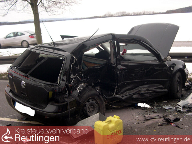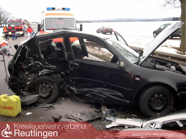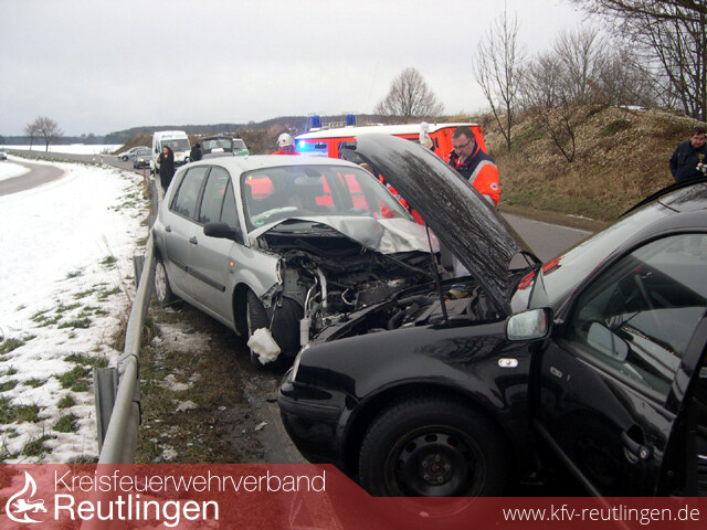 Aus noch ungeklärter Ursache kam am Donnerstag Mittag ein schwarzer VW Golf der in Fahrtrichtung Hülben unterwegs war auf den Seitenstreifen, beim Gegenlenken übersteuerte der PKW und schleuderte auf die Gegenfahrbahn. Dort kollidierte der Golf mit einem Renault der in Richtung Grabenstetten unterwegs war. Durch den heftigen Aufprall wurden die beiden PKW total zerstört. An der Einsatzstelle eingetroffen, stellte sich heraus, daß niemand mehr im PKW eingeschlossen war.