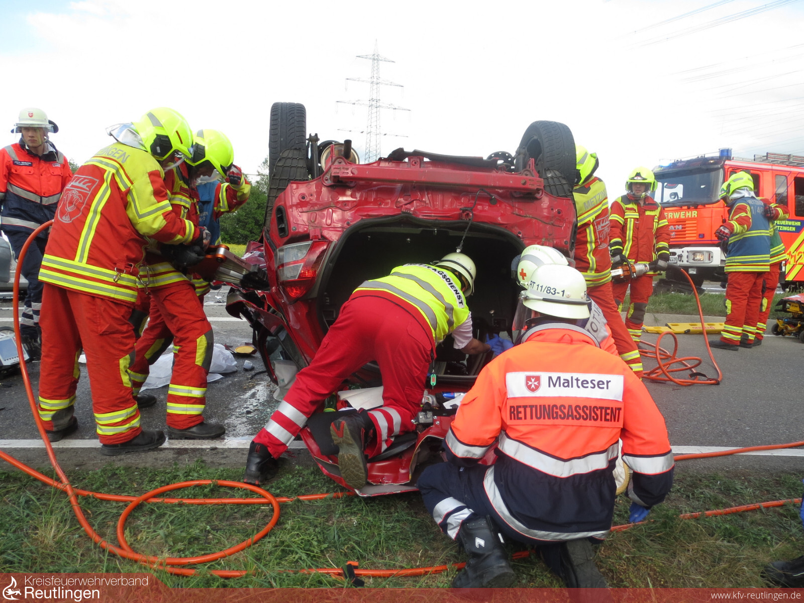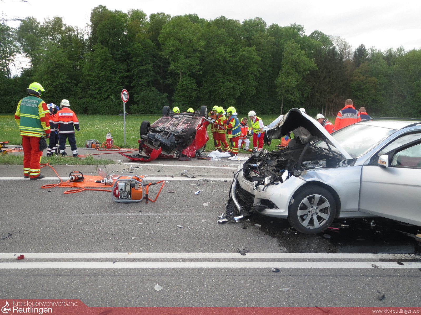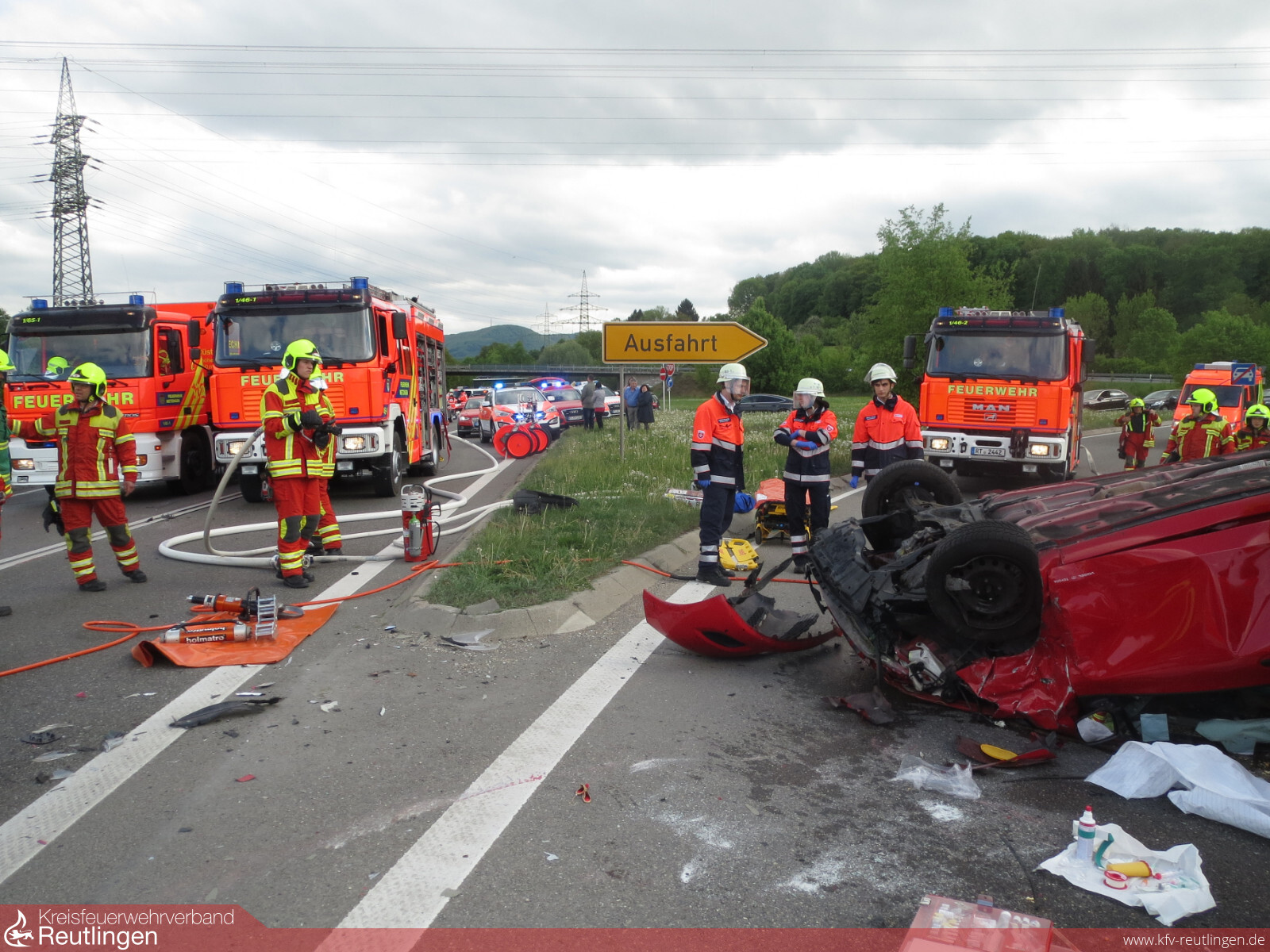 Durch den Anstoß wurde der Seat Ibiza nach rechts von der Fahrbahn abgewiesen und kam abseits der Fahrbahn zum Stehen. Sowohl die Fahrerin als auch der 9-jährige Beifahrer wurden schwer verletzt. Der in Richtung Stuttgart fahrende Toyota geriet nach dem Anstoß nach links in den Gegenverkehr und kollidierte frontal mit einem entgegenkommenden Mercedes und rutschte anschließend auf dem Dach in die Ausfahrspur, wo er zum Unfallendstand kam. Die im Toyota befindlichen beiden Personen im Alter von 46 und 22 Jahren wurden in ihrem Auto eingeklemmt. Sie mussten von der Feuerwehr mit zwei hydraulischen Rettungssätzen befreit werden. Beide Frauen wurden mit lebensgefährlichen Verletzungen in umliegende Kliniken gebracht. Drei der vier Insassen der Mercedes C-Klasse wurden leicht verletzt, eine weitere 62-jährige Mitfahrerin, die den Sicherheitsgurt nicht angelegt hatte, prallte von hinten massiv gegen den Beifahrersitz und erlitt ebenfalls schwere Verletzungen.