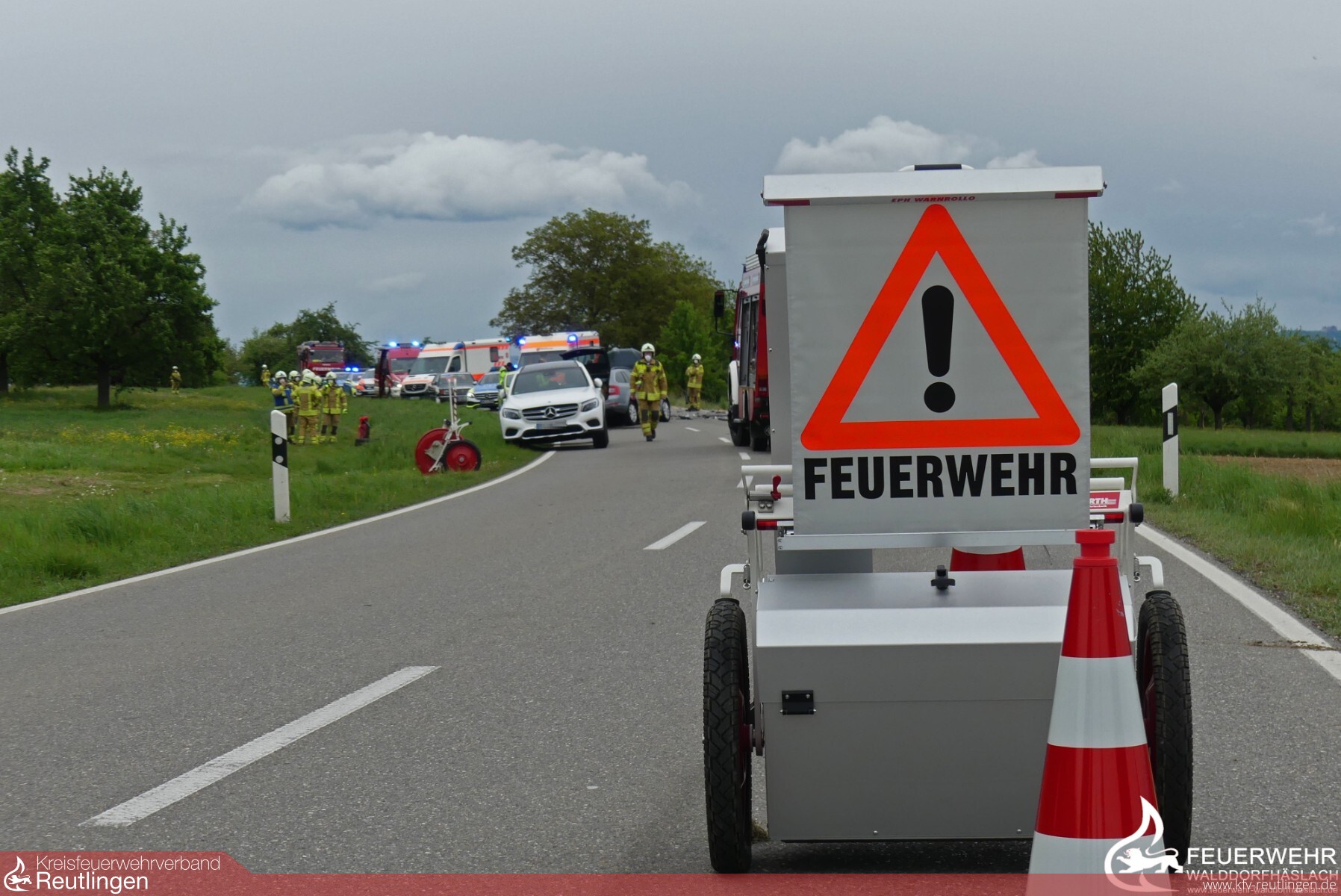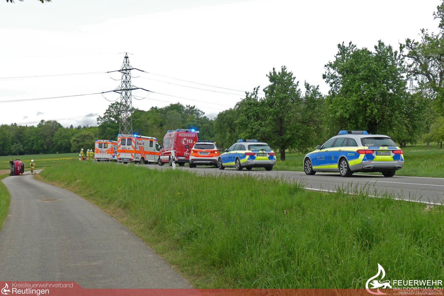 Gegen 16 Uhr wurden wir am Donnerstagnachmittag zu einem schweren Verkehrsunfall auf die B464 Richtung Dettenhausen alarmiert. Kurz vor der Waldeinfahrt kam es zu einem schweren Verkehrsunfall, bei dem zwei Fahrzeugen miteinander kollidierten. Eines der beiden überschlug sich dabei und landete auf der rechten Autoseite im Feldbereich. Beim Eintreffen der Feuerwehr hatten beide Fahrer das Fahrzeug gemeinsam mit Ersthelfern verlassen und wurden an den Rettungsdienst übergeben. Die Feuerwehr Walddorfhäslach sicherte gemeinsam mit der Polizei die Unfallstelle ab, nahm auslaufende Betriebsstoffe auf und klemmte die Batterie an den Fahrzeugen ab. Ebenfalls stellten wir den Brandschutz an der Einsatzstelle sicher. Nachdem es für uns keine Tätigkeiten mehr gab, rückten wir in Absprache mit der Verkehrspolizei zügig wieder ein. Die B464 wurde noch ca. eine Stunde von der Polizei zur Unfallaufnahme abgesperrt.