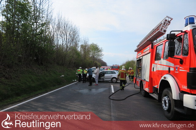 Zu einem schweren Verkehrsunfall ist es am Freitagnachmittag kurz nach 16.30 Uhr auf der B312 zwischen Lichtenstein-Unterhausen und Pfullingen- Süd auf Höhe des Gewanns Aischbach gekommen. Der 84 jährige Fahrer eines Pkw Audi A3 fuhr von Unterhausen in Richtung Reutlingen und kam aus noch nicht bekannter Ursache langsam nach links auf die Gegenfahrbahn. Hier streifte er einen entgegenkommenden Lkw Daimler Benz an dessen hinteren linken Fahrzeugeck und stieß anschließend frontal mit seitlicher Versetzung mit einem ordnungsgemäß hinter dem Lkw in Richtung Unterhausen fahrenden VW Polo zusammen. Durch die Wucht des Aufpralls wurde der VW Polo etwa 5 Meter zurückgeschoben. Der Fahrer des Audi sowie die 47 jährige Fahrerin des VW Polo und ihre 3 auf der Rückbank sitzenden Mitfahrerinnen im Alter von 12 und zweimal 17 Jahren erlitten schwere Verletzungen, wobei eine 17- Jährige mit dem Rettungshubschrauber in eine Klinik geflogen werden musste. Der 47 jährige Beifahrer im VW Polo kam mit leichteren Verletzungen davon. Der 27 jährige Lkw-Fahrer blieb unverletzt. An dem Pkw Audi wie auch dem VW Polo entstand jeweils ein wirtschaftlicher Totalschaden. Der Lkw wurde nur leicht beschädigt. Die Höhe des entstandenen Sachschadens beträgt nach ersten Schätzungen 7 000 Euro. Der Rettungsdienst war mit einer Vielzahl von Kräften und unter anderem auch einem Rettungshubschrauber im Einsatz. Die Feuerwehr Pfullingen war mit 3 Fahrzeugen und 10 Einsatzkräften vor Ort. Die B 312 musste zwischen Unterhausen und Pfullingen-Süd / Einmündung Klosterstraße zur Versorgung der Verletzten, Bergung der Fahrzeuge und Reinigung der Fahrbahn bis 19.00 Uhr voll gesperrt werden. Eine Umleitung war zunächst über die Roßwagstraße eingerichtet. Nachdem sich in Richtung Unterhausen ein Rückstau im Ursulabergtunnel bildete, der sich nur äußerst zäh auflöste, musste auch dieser gegen 17.20 Uhr gesperrt und die örtliche Umleitung entsprechend ausgedehnt werden. Mit Freigabe der Unfallstelle gegen 19.00 Uhr wurde gleichzeitig auch die Sperrung des Tunnels wieder aufgehoben.