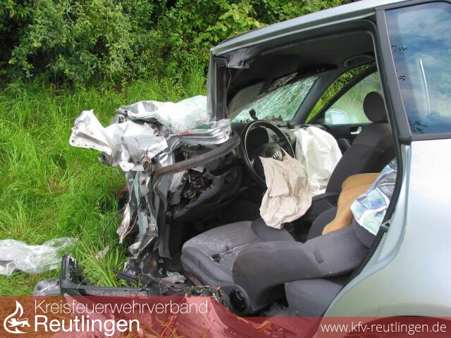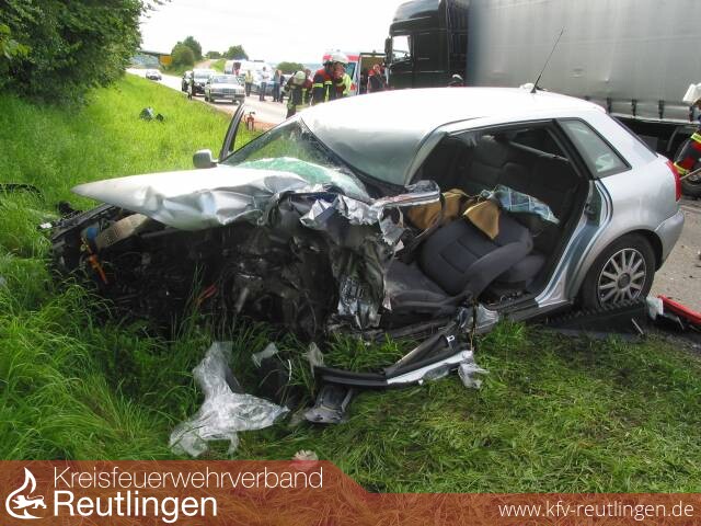 Der Audi-Fahrer wich bei Erkennen der Situation auf den Fahrstreifen für den Gegenverkehr aus und prallte hier frontal mit der Sattelzugmaschine zusammen. Der 24-jährige wurde in seinem Fahrzeug eingeklemmt und musste mit hydraulischen Rettungsgeräten von der Feuerwehr befreit werden. Vor Ort befanden sich die Feuerwehren Dettingen/Erms mit 3 Fahrzeugen und der Rettungsdienst mit insgesamt 4 Fahrzeugen. Durch den verständigten Rettungsdienst wurde der 20-jährige mit schweren Verletzungen in eine Klinik eingeliefert. Der Lkw-Fahrer wurde leicht verletzt. Während der Unfallaufnahme war die B 28 voll gesperrt. Es kam zu erheblichen Verkehrsbehinderungen.