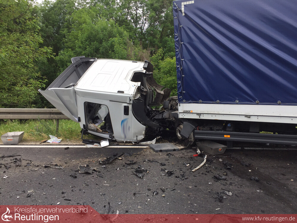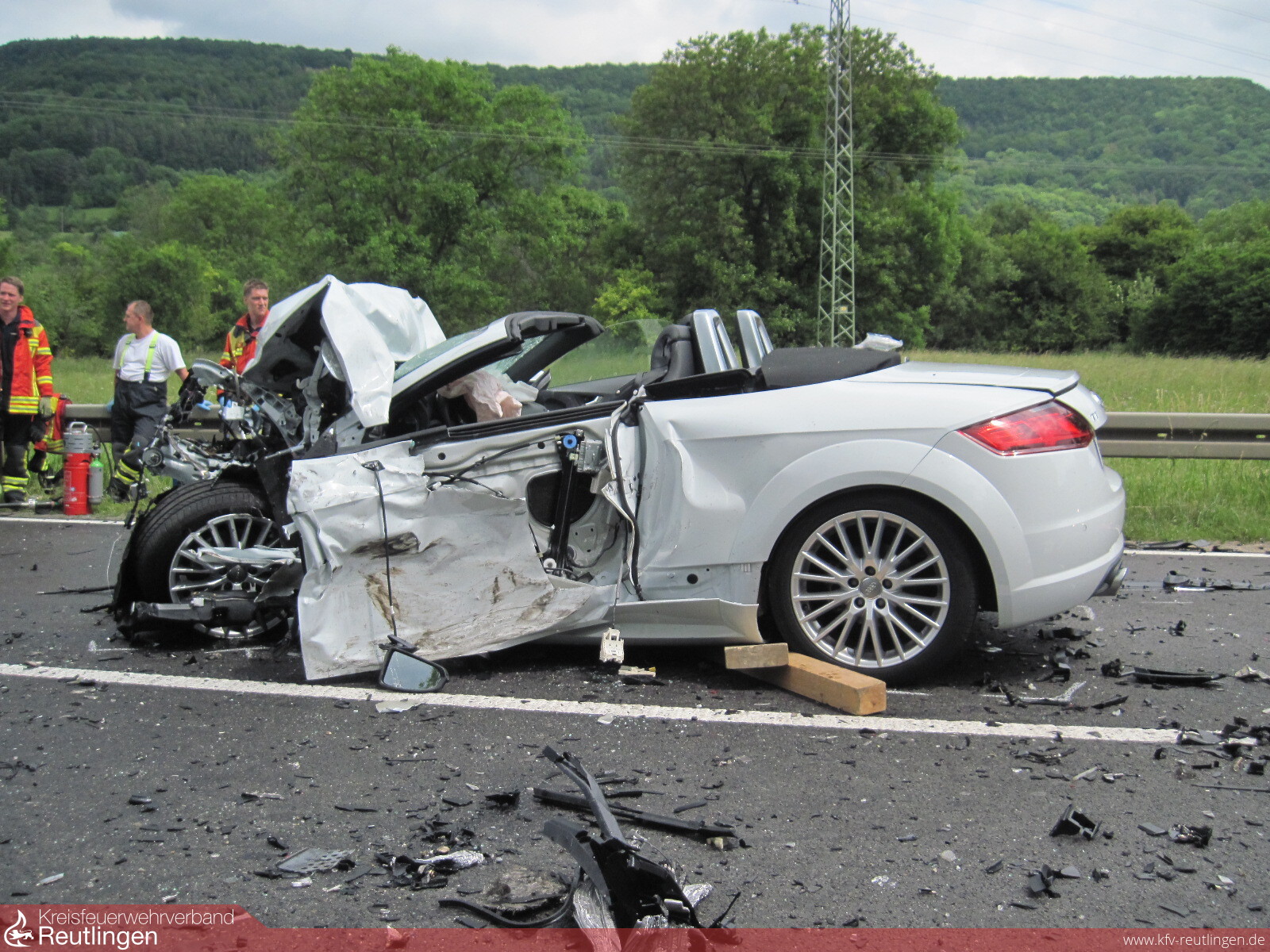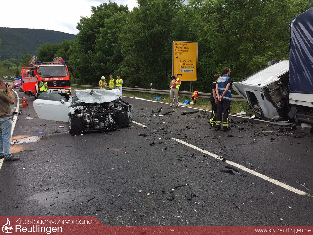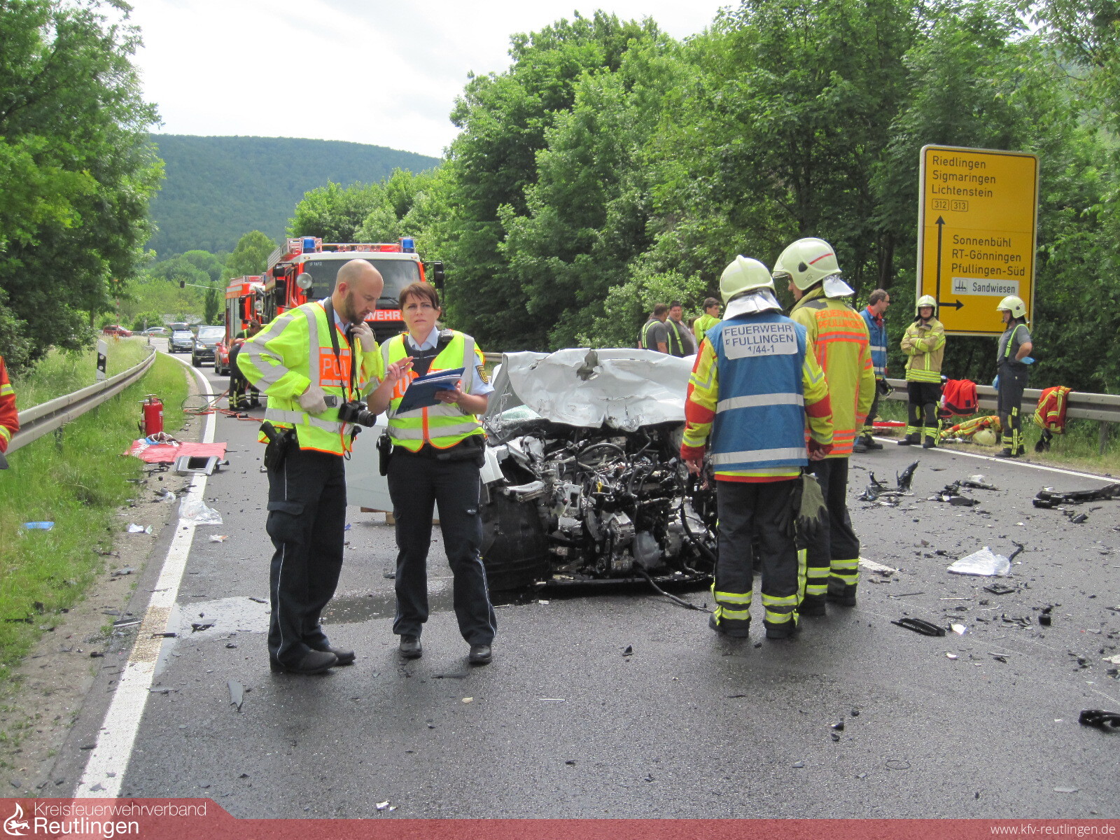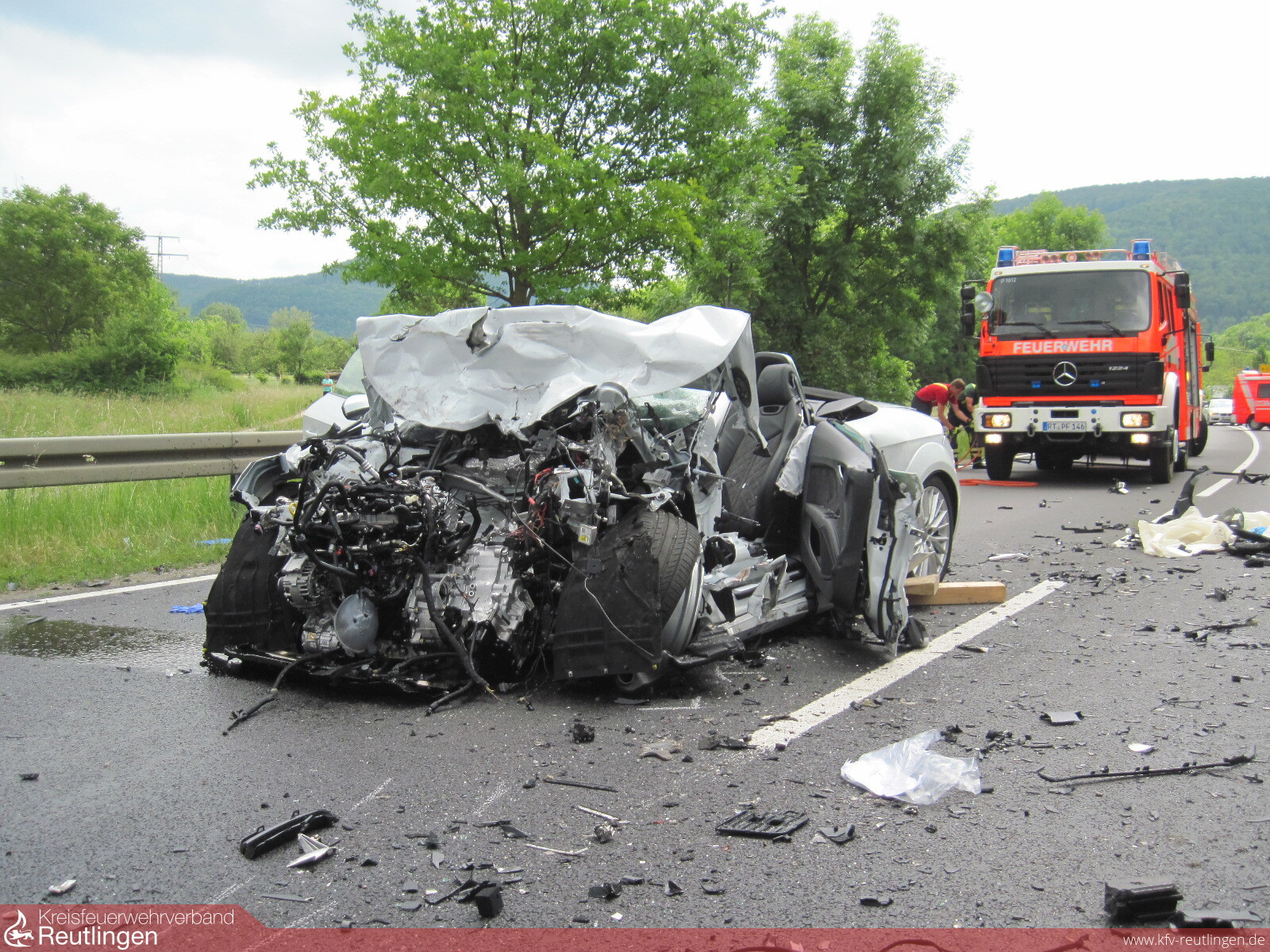 Der Mann befuhr mit einem Audi TT die B 312 von Lichtenstein herkommend in Richtung Pfullingen. Kurz vor dem Ursulabergtunnel überholte er in einer langgezogenen Rechtskurve trotz Überholverbots den Toyota eines Gleichaltrigen. Während des Überholvorgangs kam es zum Frontalzusammenstoß mit dem entgegenkommenden 7,5 Tonnen-Lkw eines ebenfalls 44 Jahre alten Mannes. Anschließend wurde der Audi auf die ursprüngliche Fahrbahn zurückgeschleudert und kollidierte mit dem Toyota. Der Unfallverursacher war in seinem Fahrzeug eingeklemmt und musste von der Feuerwehr befreit werden. Der Mann erlitt schwerste Verletzungen, denen er noch an der Unfallstelle erlag. Der Toyota-Lenker und seine beiden Mitfahrer zogen sich leichte Verletzungen zu. Der Lkw-Fahrer erlitt so schwere Verletzungen, dass er in einer Klinik stationär aufgenommen werden musste. Der Schaden an den Fahrzeugen wird auf knapp 100.000 Euro geschätzt.