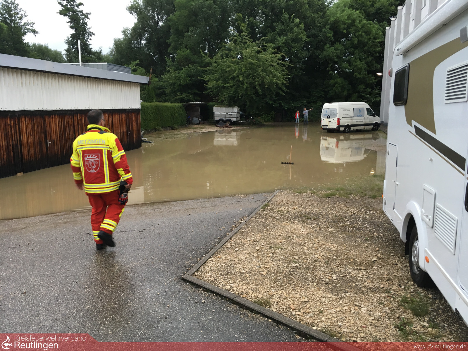 Zu über 50 unwetterbedingten Hochwassereinsätzen wurde am Sonntag die Feuerwehr Metzingen in alle 3 Ortsteile alarmiert. Mit 72 Einsatzkräften aus den Abteilungen Stadtmitte, Neuhausen und Glems mussten in 6 Stunden dutzende Keller und Tiefgaragen ausgepumpt werden.