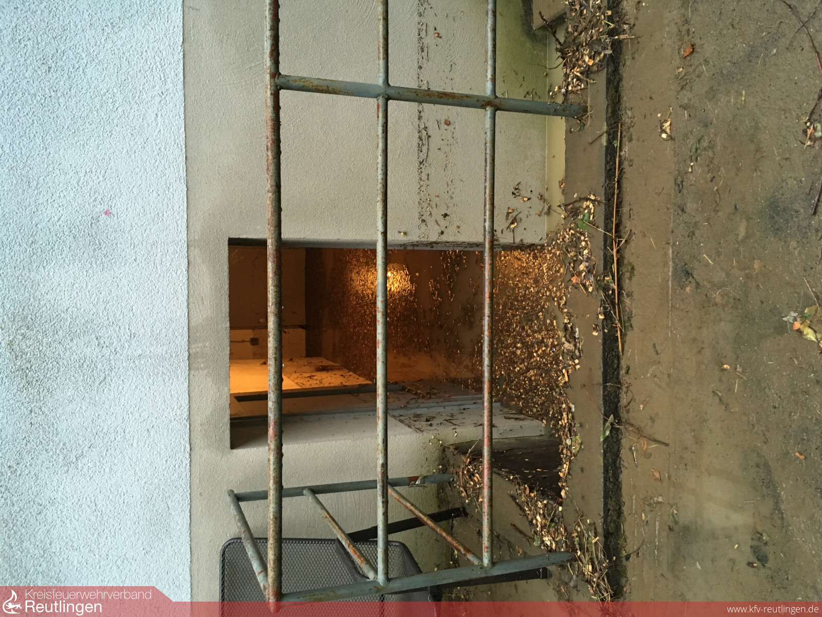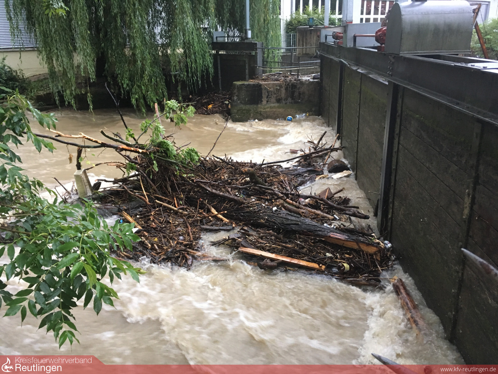 Ein ähnliches Bild bot sich den Einsatzkräften am Schwöllbogen, wo Treibgut das Wehr blockierte und die Erms ebenfalls über die Ufer trat. Mit einer ortsansässigen Baufirma und einem Helfer des THW’s, wurden hier etliche Baumstämme und Unrat aus der Erms entfernt.