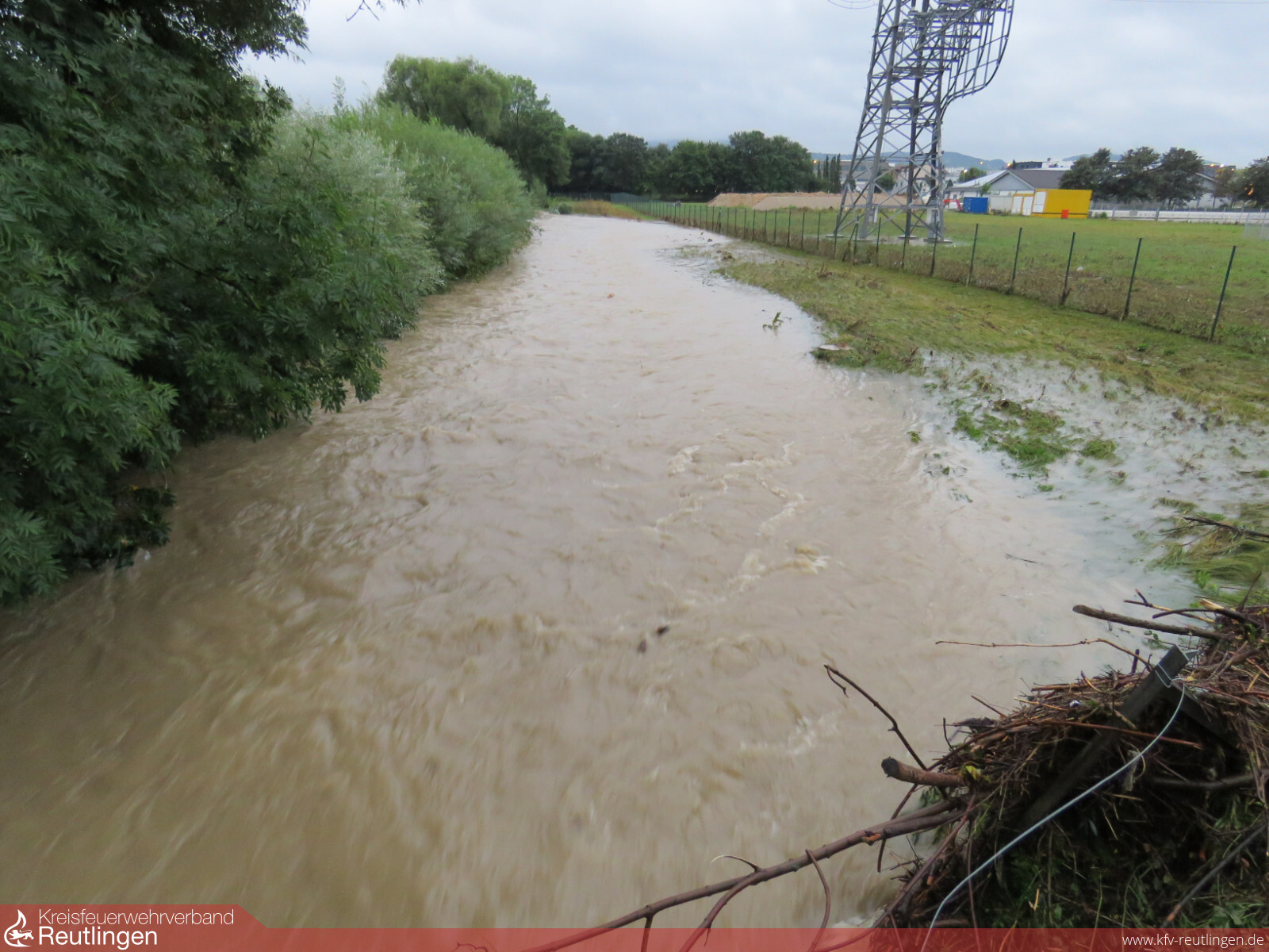 Im Loschenwiesenweg in Neuhausen trat die Erms bereits über die Ufer. Die Anwohner haben in Eigenregie die Fluten abgehalten. Nach Rückgang des Hochwassers wurde zur Sicherheit und zum Schutz vor etwaigen weiteren Flutwellen Betonblock-Elemente aufgebaut.