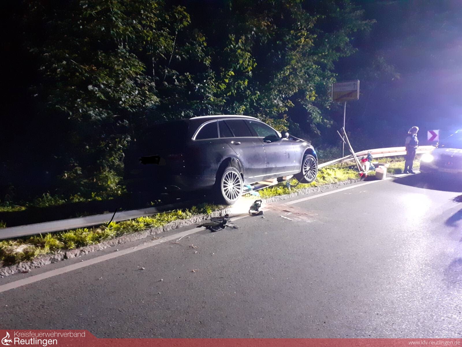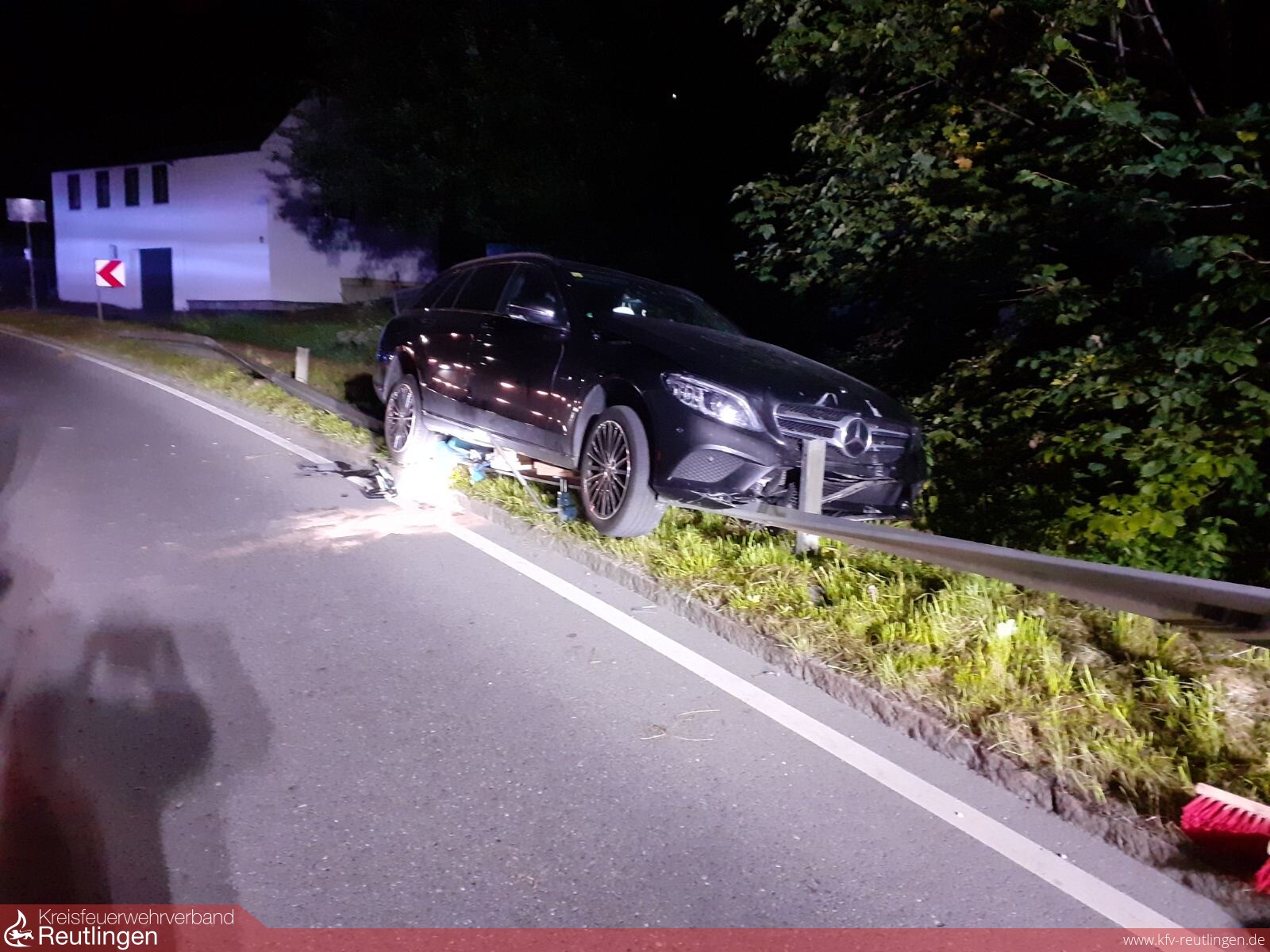 Die Feuerwehr Lichtenstein wurde in der Nacht von Freitag auf Samstag zu einer Hilfeleistung nach Verkehrsunfall alarmiert. Der Fahrer des Mercedes kam in der langgezogenen Rechtskurve in Fahrtrichtung Unterhausen nach links von der Fahrbahn ab und schlitterte dabei auf einer Länge von ca. 20 Meter die dortige Leitplanke entlang. Auf dieser blieb das Fahrzeug mit aufgeschlitzten Tank liegen.