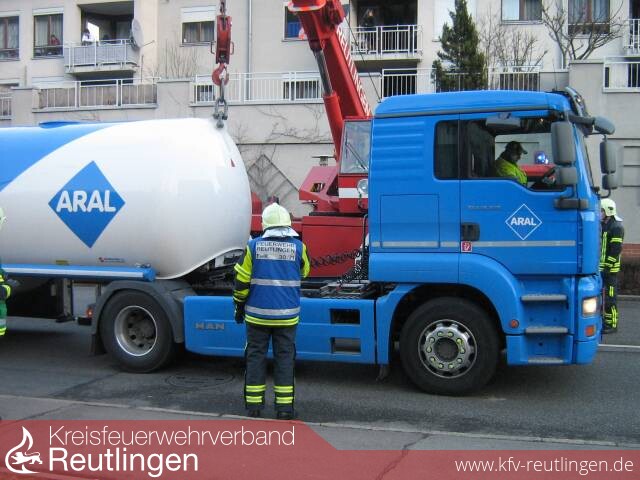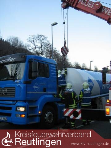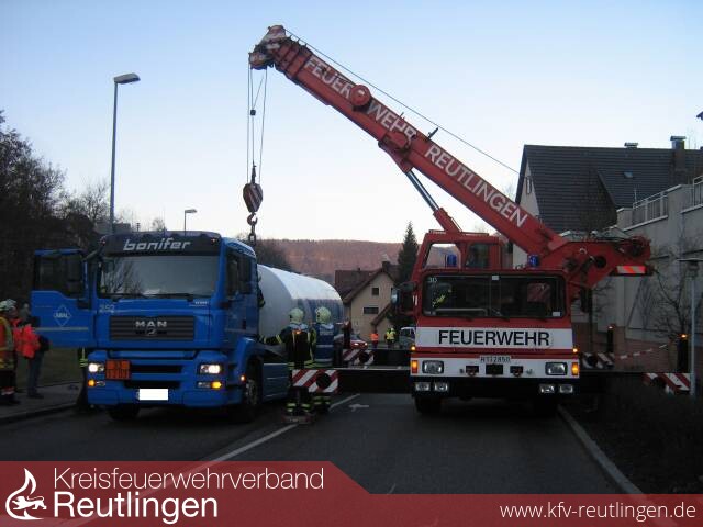 Gegen 13.45 Uhr wurde die Reutlinger Feuerwehr mit dem Feuerwehrkran nach Lichtenstein - Unterhausen alarmiert. Beim Wiederanfahren eines Tanklastzuges, der mit 30.000 l Heizöl beladen war, sprang der Auflieger aus noch nicht geklärten Gründen aus der Kupplung des Sattelzuges, blieb aber mit seinem Verbindungsstück am Rahmen des Chassis hängen und krachte deshalb nicht auf die Fahrbahn.