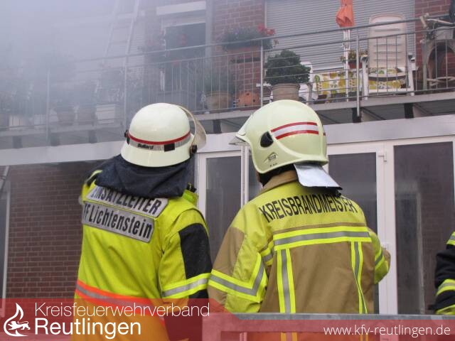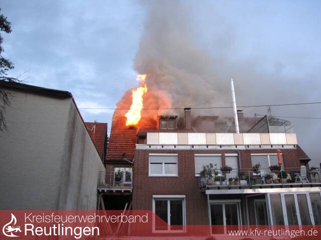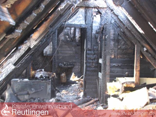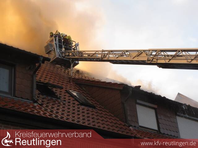Mit dem Einsatzstichwort Brand Gebäude wurde die Feuerwehr Lichtenstein am Dienstag morgen um 5:55 Uhr nach Holzelfingen in die Honauer Straße alarmiert. Bereits beim Eintreffen der ersten Einsatzkräfte hatten sich alle Bewohner aus eigener Kraft ins Freie gerettet, dadurch konnte direkt mit der Brandbekämpfung begonnen werden. Durch das kontrollierte und umsichtige Vorgehen der Angriffstrupps sowohl über die Gebäude Vorderseite (Treppenraum) als auch über die Gebäude Rückseite die über Steckleiterteile vorgenommen wurde, konnte eine Durchzündung des Dachstuhles verhindert werden. Unterstützt wurden die Trupps durch die DLK 23/12 der Feuerwehr Pfullingen. Im Einsatz waren 6 C-Rohre, davon 3 C-Rohre im Innenangriff ein weiteres C-Rohr wurde von der DLK 23/12 vorgenommen und ein B-Rohr zur Sicherung des Nachbargebäudes. Etwa eine Stunde nach Alarmierung hatte die Feuerwehr den Brand unter Kontrolle, die Nachlöscharbeiten dauerten noch bis in die Mittagsstunden. Am Frühen Nachmittag wurde das Dach von der Höhensicherungsgruppe der Feuerwehr Pfullingen unterstützt durch die DLK mit einer Plane abgedeckt.Um 16:00 Uhr waren alle Fahrzeuge der Feuerwehr Lichtenstein wieder Einsatzbereit am Standort.