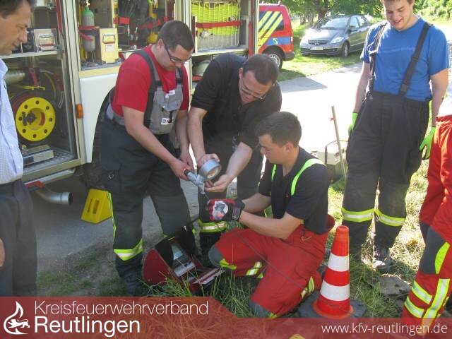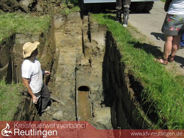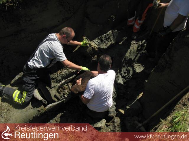 Zu einem ebenso kuriosen wie zeitaufwendigen Einsatz wurde am vergangenen Feitag gegen 7.45 Uhr die kleine Tageseinsatzgruppe der Freiw. Feuerwehr Grafenberg gerufen. Am Hohlweg waren zwei Lämmer der dort weidenden Schafherde durch eine wohl morsche Schachtabdeckung aus Holz in einen Abwasserschacht eingebrochen. Während sich beim Eintreffen der Besitzer ein Lamm noch im 1,5 Meter tiefen Schacht aufhielt und von dort gerettet wurde war das zweite Tier in den Abwasserkanal mit ca. 30 cm Durchmesser gekrochen und steckte dort offensichtlich fest, worauf die Feuerwehr alarmiert wurde. Nach dem Einreffen der Einsatzkräfte galt es zunächst das Lamm in dem ca. 50 Meter langen Abschnitt zwischen zwei Schächten zu lokalisieren. Über die Leitstelle konnte mit Hilfe der Feuerwehr Metzingen eine Rohrkamera organisiert werden. Diese Kamera wurde nun an mit Druckluft befüllte C-Schläuche gebunden, welche in den Kanal geschoben werden konnten. Nach knapp 28 Metern, also so ziemlich in der Mitte des Rohrabschnittes konnte das Tier dann lebend lokalisiert werden. Da es offensichtlich dort feststeckte blieb nach mehreren Beratungen keine andere Wahl, als das Rohr mit Hilfe eines Baggers freizulegen und zu öffnen. Nach etwa 4 Stunden war es dann soweit. Das Lamm wurde zwar etwas verängstigt und erschöpft aber wohlbehalten aus seiner Zwangslage befreit und konnte vom Besitzer wieder zur Herde zurückgebracht werden. Für die Grafenberger Wehrleute hieß es dann noch alle Gerätschaften zu reinigen und wieder an Ort und Stelle zu bringen, so dass der Einsatz gegen 13.00 Uhr beendet werden konnte. Am Einsatz beteiligt waren: Die Feuerwehr Grafenberg mit 9 Einsatzkräften und zwei Fahrzeugen. Die Feuerwehr Metzingen mit 2 Kräften und einem Fahrzeug. Der Leiter des Grafenberger Bauhofes mit einem Fahrzeug. Frau Bürgermeisterin Annette Bauer, sowie ein Bauunternehmen mit einem Bagger, einem LKW, einem weiteren Fahrzeug und 3 Personen.