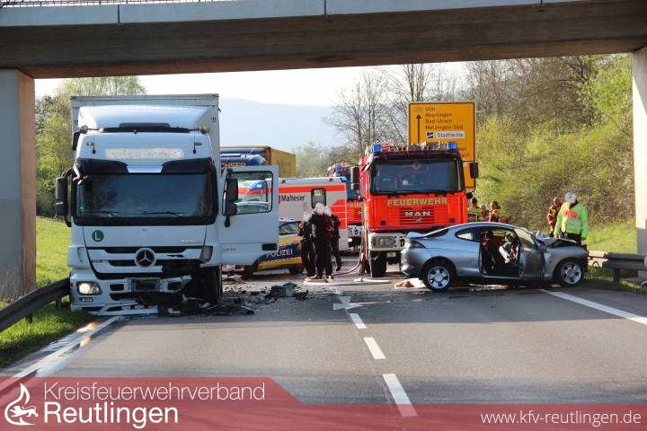 Der Unfall ereignete sich kurz nach der Anschlussstelle Längenfeld. Zu dieser Zeit war der Mann aus dem Landkreis Reutlingen mit seinem Ford auf der Bundesstraße in Richtung Reutlingen unterwegs. Aus unbekannter Ursache geriet er in Höhe des so genannten „Brünnele“ mit seinem Fahrzeug auf die Gegenfahrbahn und stieß dort frontal mit dem 19-Tonner zusammen, der von einem 56-jährigen gesteuert wurde. Der Brummifahrer versuchte noch nach rechts auszuweichen, streifte hierbei die Leitplanke und konnte trotz Vollbremsung die Kollision nicht verhindern. Der Senior wurde in seinem total zertrümmerten Fahrzeug eingeklemmt und musste mit dem Spreizer befreit werden. Der 73-Jährige hatte sich jedoch so schwere Verletzungen zugezogen, dass er noch an der Unfallstelle nach Reanimationsversuchen verstarb.