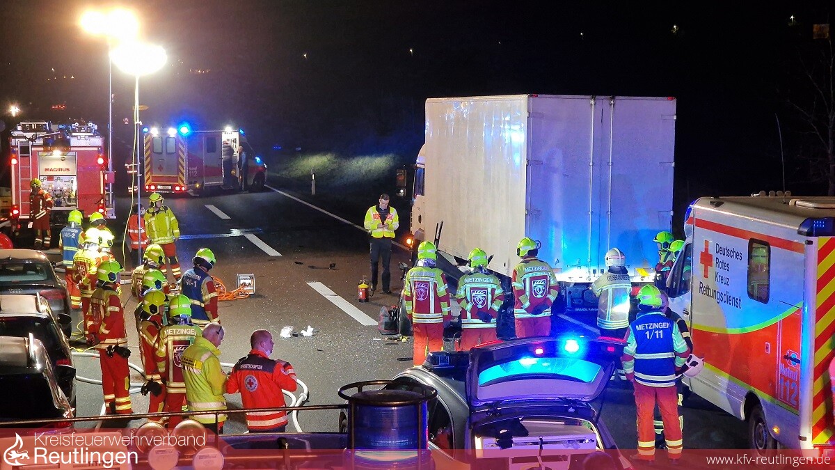 Ein Todesopfer ist bei einem Verkehrsunfall auf der Bundesstraße 28 in Höhe Metzingen zu beklagen. Ein 20 Jahre alter Fahrer eines Mini Coopers war auf der Bundesstraße in Richtung Bad Urach unterwegs. Zwischen den Anschlussstellen West und Süd prallte der Wagen nahezu ungebremst unter einen Lastwagen, der im Bereich der Abbiegespur stand und eine Panne hatte. Seitlich versetzt krachte der Mini Cooper unter den MAN. Durch den Unfall wurde der im Mini Cooper befindliche 18-jährige Beifahrer im Fahrzeug eingeklemmt und erlag noch vor Ort seinen schweren Verletzungen. Der 20 Jahre alte Autofahrer musste durch die Einsatzkräfte der Feuerwehr Metzingen, die mit dem Rüstzug an die Einsatzstelle ausgerückt war, aus seinem Fahrzeug befreit werden. Nach der Erstversorgung kam er anschließend schwer verletzt in ein Krankenhaus. Der Fahrer des Lastwagens und sein Beifahrer erlitten einen Schock und mussten ebenfalls ärztlich betreut werden. Zur Klärung der genauen Unfallursache ist ein Gutachter beauftragt worden. Die Ermittlungen vor Ort hattte die Verkehrspolizei Tübingen übernommen. Die Feuerwehr befreite den Beifahrer mit hydraulischem Rettungsgerät, leuchtete die Unfallstelle aus und unterstützte Polizei und Rettungsdienst bei ihren Maßnahmen. Zur Bergung des Lastwagens, dem durch die Wucht des Aufpralls die Hinterachse in Teilen herausgerissen worden war, kam ein Spezial-Bergungsfahrzeug zum Einsatz. Die Straßenmeisterei Eningen unterstützte bei den notwendigen Umleitungs- und Absperrmaßnahmen, die bis rund 3 Uhr dauerten. Der von der Feuerwehr Reutlingen alarmierte Kran kam nicht zum Einsatz. Neben der Feuerwehr war der Rettungsdienst mit drei Rettungswagen und zwei Notarzt-Einsatzfahrzeugen, zwei Notärzte und dem organisatorischer Leiter vor Ort.
