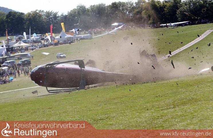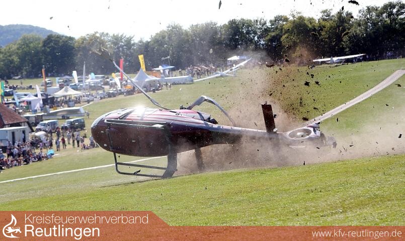 Zu dem tragischen Unglücksfall kam es gegen 16.15 Uhr zu Beginn einer Hubschrauberflugvorführung. Beim Start stürzte der mit Pilot und Copilot besetzte Hubschrauber aus noch nicht geklärter Ursache aus geringer Höhe auf die Seite. Durch umher fliegende Hubschraubertrümmerteile wurde ein 38 jährige Mann so schwer verletzt, dass er trotz sofortiger ärztlicher Hilfe an der Unglücksstelle verstarb. Zwei Zuschauer – eine 58jährige Frau und ein 47jähriger Mann – wurden schwer verletzt und mit Rettungshubschrauber bzw. Rettungstransportwagen in Kliniken nach Tübingen und Reutlingen verbracht. Ein weiterer Zuschauer sowie die beiden Insassen des Hubschraubers wurden mit leichten Verletzungen in das Krankenhaus Bad Urach bzw. Reutlingen eingeliefert.