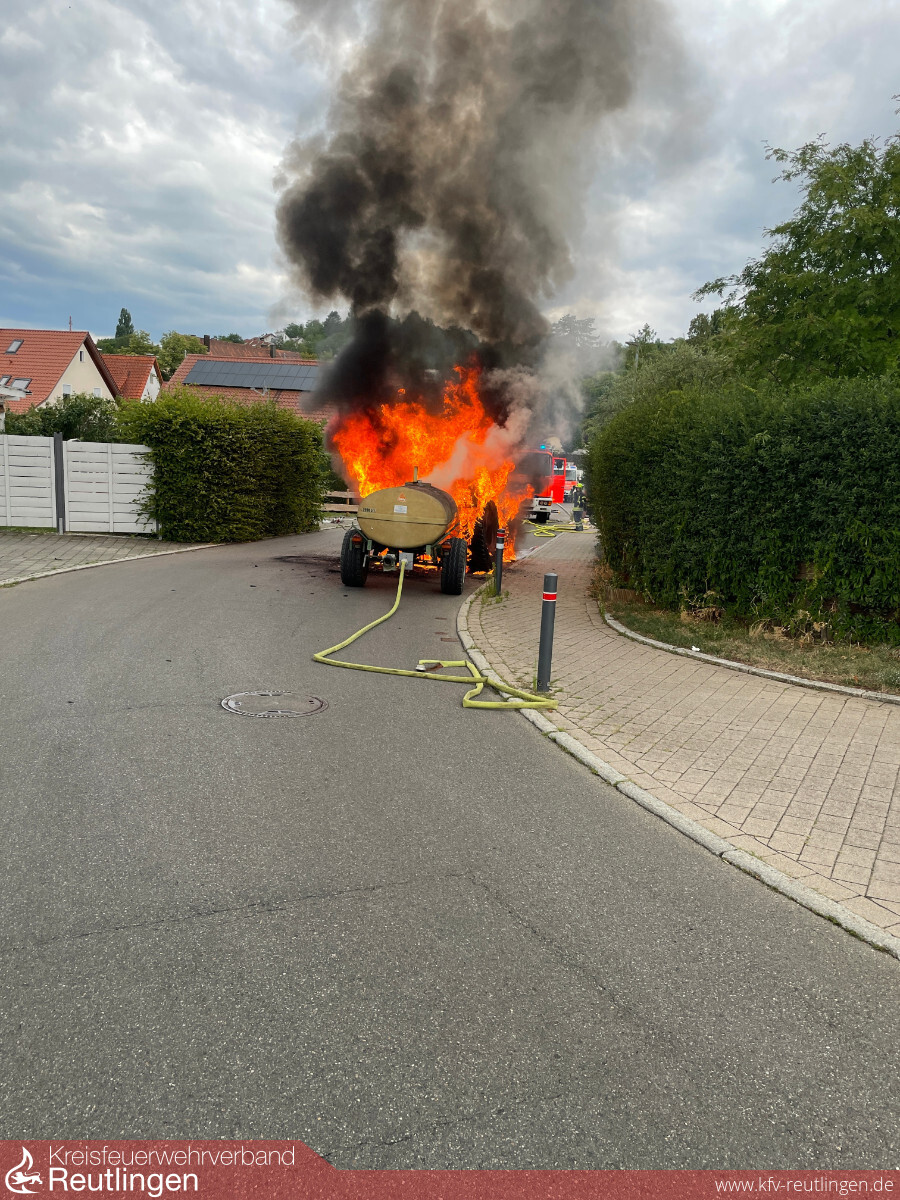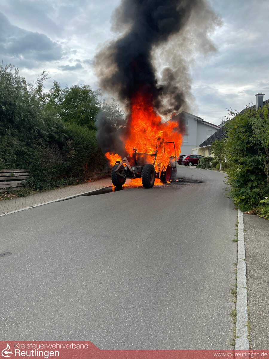Um 13:22 Uhr wurde die Eninger Feuerwehr zu einem gemeldeten LKW-Brand alarmiert. Bereits auf der Anfahrt war eine deutlich sichtbare Rauchentwicklung wahrzunehmen. Vor Ort konnte ein Traktor im Vollbrand vorgefunden werden. Rasch wurde das Feuer mit zwei Rohren bekämpft und abgelöscht. Im weiteren Verlauf des Einsatzes reinigte eine Fachfirma die Fahrbahnoberfläche im Bereich des Brandobjekts.