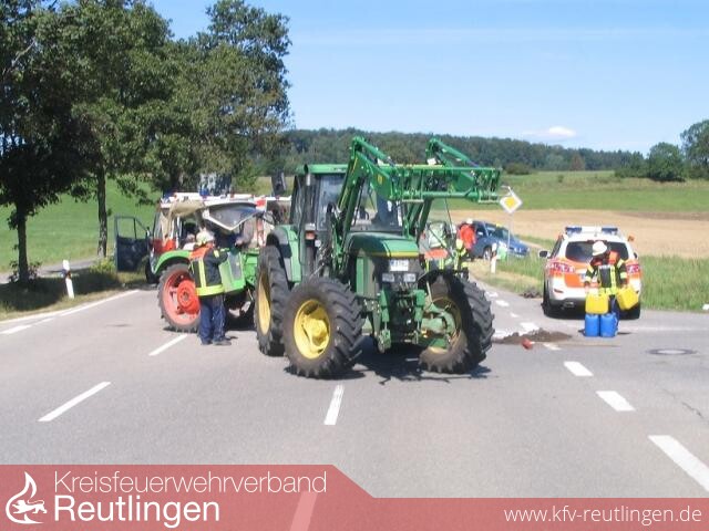Am Montag, den 27.08.12 um 13.51 Uhr musste die Feuerwehr Sonnenbühl zu einer Hilfeleistung nach VU zwischen Erpfingen und Undingen ausrücken. Ein Traktor war an einer Kreuzung mit einem Kleintransporter zusammengestoßen. Beim Zusammenprall kippte der Traktor um, der Fahrer wurde auf die Fahrbahn geschleudert, verletzte sich mittelschwer und musste vom Rettungsdienst ins Krankenhaus gebracht werden. Der Fahrer des Kleintransporters kam mit dem Schrecken davon. Ausgelaufene Betriebsstoffe der Fahrzeuge wurden durch die Feuerwehr aufgenommen. Nach Beendigung der Unfallaufnahme, wurde die Fahrbahn gereinigt. Im Einsatz war die Abteilung Erpfingen mit 9 Mann.
