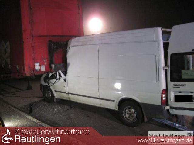 Dort war ein Transporter Typ Ford Transit, beladen mit Zeitungen und Zeitschriften,auf die Stirnseite eines ordnungsgemäß abgestellten Sattelaufliegers ungebremst aufgefahren. Das Fahrzeug schob sich dabei ca. 2,5m, nahezu bis zur Rückenlehne der Sitze unter den Auflieger. Die Fahrerin wurde eingeklemmt. Der Transporter wurde zunächst mit der Seilwinde des Feuerwehrkrans unter dem Auflieger hervor gezogen. Danach konnte die Fahrerin unter Einsatz von hydraulischem Rettungsgerät, Rettungspreizer und Schneidgerät, von der Feuerwehr befreit werden. Die Fahrerin wurde dem Rettungsdienst übergeben, der äußerlich nur leichte Verletzungen feststellen konnte. Zur weiteren Untersuchung wurde sie ins Klinikum gebracht.