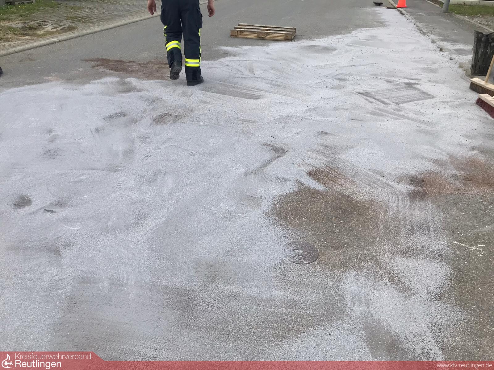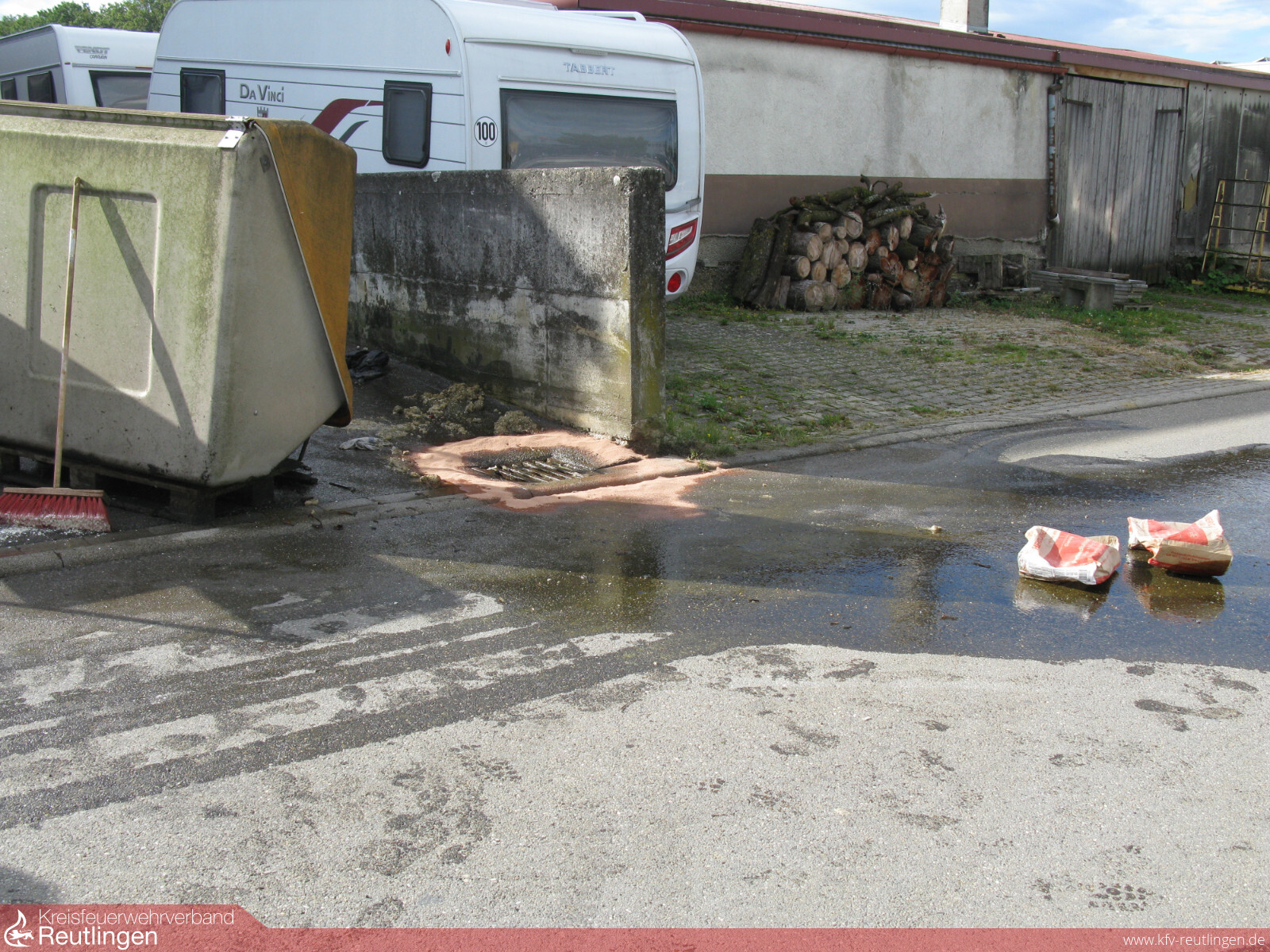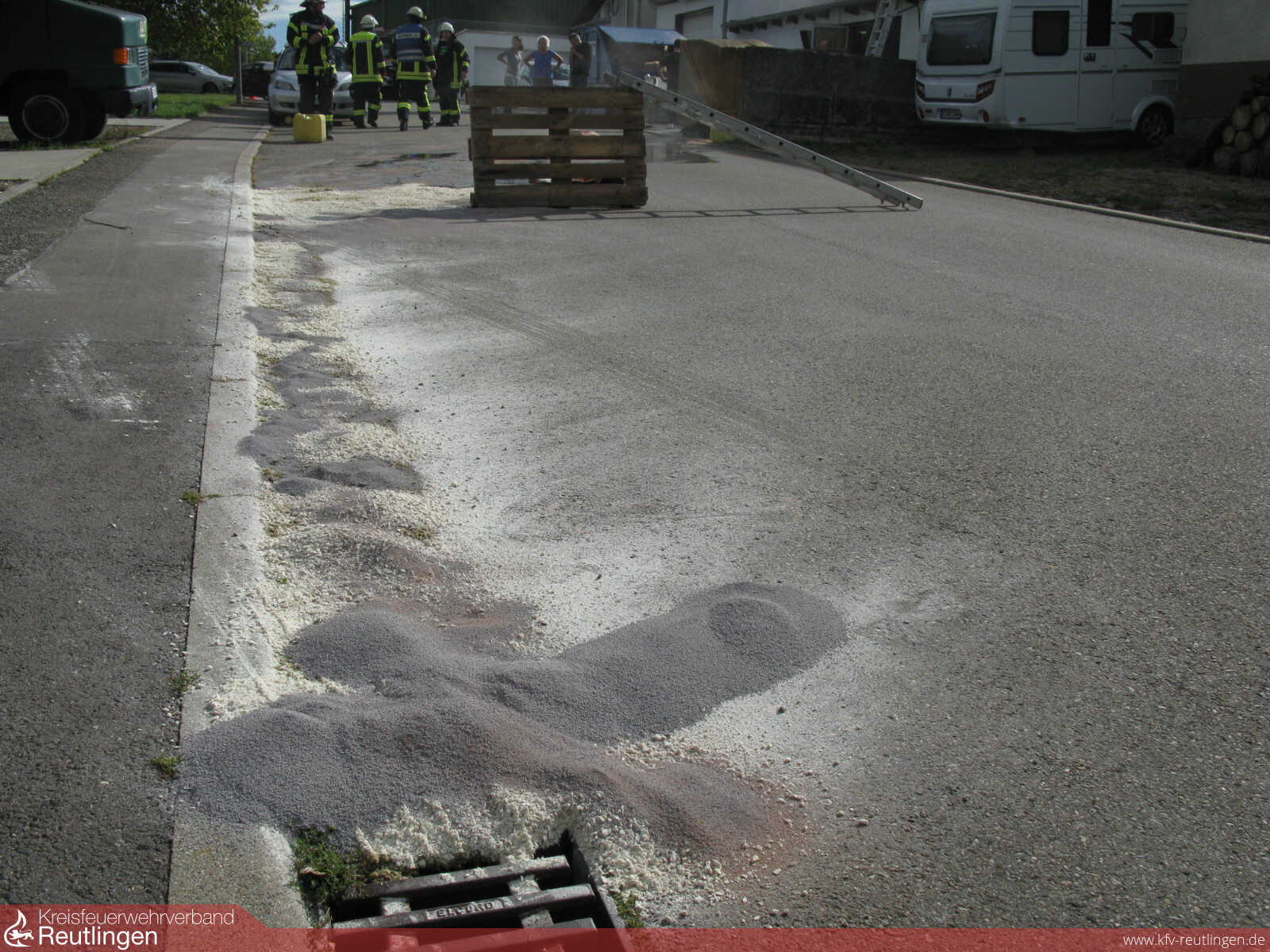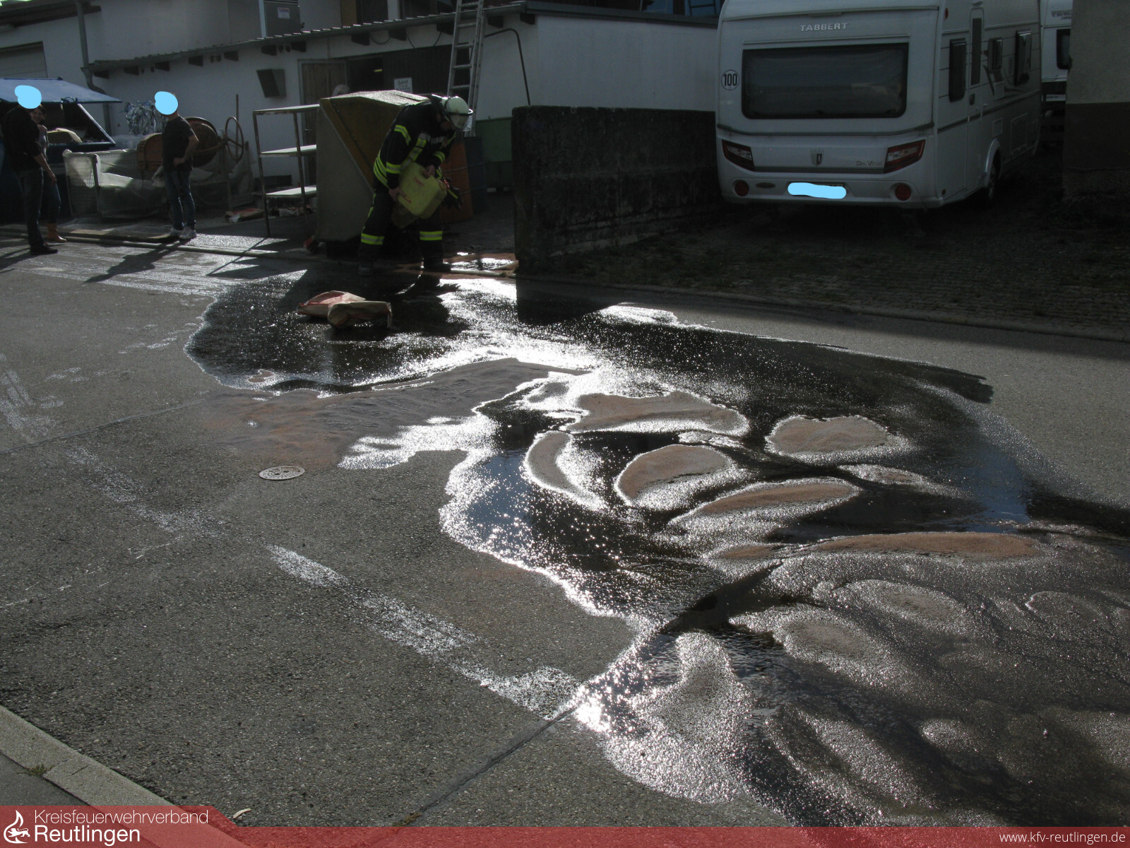 Zu einem Umwelteinsatz wurde die Freiwillige Feuerwehr Grafenberg am vergangenen Dienstag, dem 01. Oktober um 10.49 Uhr ins Grafenberger Gewerbegebiet gerufen. Auf dem Hof einer Firma für Kunststofftechnik war beim Umsetzen mit einem Gabelstapler ein Behälter mit Hydrauliköl umgekippt. Hierbei lief eine größere Menge der Flüssigkeit aus, verteilte sich auf der Straße und gelangte teilweise in die Kanalisation. Das sich auf der Straße befindliche Öl konnte mittels Ölbinder aufgenommen werden und wurde über den örtlichen Bauhof entsorgt. Auf Anweisung des Umweltschutzamtes wurde der Kanal danach kräftig durchgespült und das Öl in einem separaten Becken der Kläranlage Metzingen aufgefangen, wo es herausgefiltert werden konnte. Ein Einsatz des bei diesem Alarmstichwort automatisch mit alarmierten Gefahrstoffzuges „Erms“, bestehend aus den Feuerwehren Metzingen und Dettingen war letztendlich nicht erforderlich, da die Feuerwehr Grafenberg die Einsatzstelle selbständig abarbeiten konnte. Die Feuerwehr Grafenberg war mit zwei Fahrzeugen und 16 Kräften ebenso im Einsatz, wie der Grafenberger Bauhof, das Umweltamt Reutlingen und die Polizei Metzingen. Auch Bürgermeister Volker Brodbeck verschaffte sich vor Ort ein Bild der Lage. Der bereits alarmierte und ausgerückte Gefahrstoffzug „Erms“ musste glücklicherweise nicht tätig werden.