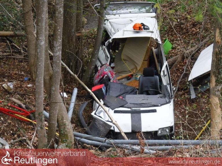 Beim Eintreffen der ersten Kräfte konnte ein Fahrzeug ca. 30 m abseits der Straße in ca. 15 m Tiefe im Wald, in einem Bachbett vorgefunden werden.