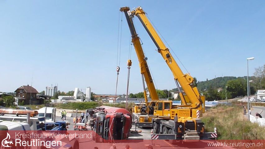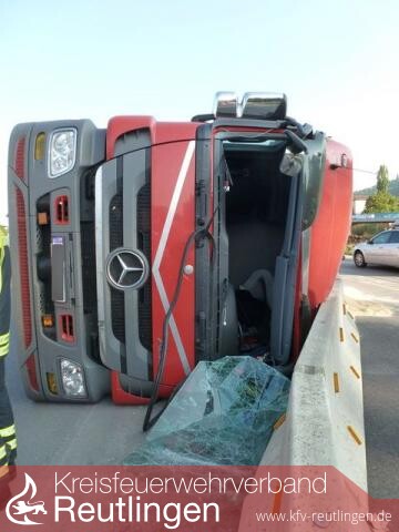 Die Feuerwehr Eningen wurde am 16. Juli 2013 gegen 07:35 Uhr zu einer Hilfeleistung nach Verkehrsunfall auf die B312 im Bereich Südbahnhof alarmiert. Dort blockierte ein umgestürzter Silozug-LKW, welcher Futtermittel geladen hatte, die zwei linken Fahrspuren. Durch die Einsatzkräfte der Feuerwehr wurden die auslaufenden Betriebsmittel aufgenommen und der Brandschutz sichergestellt. In Zusammenarbeit mit der Straßenmeisterei und der Polizei wurde die Unfallstelle abgesichert. Mit einem Radlader von einer nahegelegenen Baustelle wurden dann die durch das Unfallfahrzeug verschobenen Betonfahrbahntrennungen entfernt. Nach Eintreffen eines Spezialsaugfahrzeuges wurde die Ladung des Silozuges in ein Ersatzfahrzeug umgeladen. Erst jetzt konnte die Bergung des LKWs durch zwei Autokräne und ein Abschleppunternehmen erfolgen. Zu diesem Zweck musste die B312 für ca. eine Stunde komplett gesperrt werden. Nach der abschließenden Reinigung der Fahrbahn konnte die Einsatzstelle gegen 16:10 Uhr an Polizei und Straßenmeisterei übergeben werden. Die Feuerwehr Eningen war mit 4 Fahrzeugen und 17 Einsatzkräften im Einsatz.
