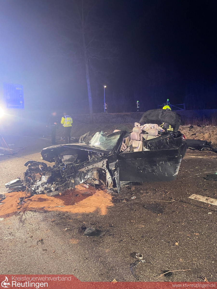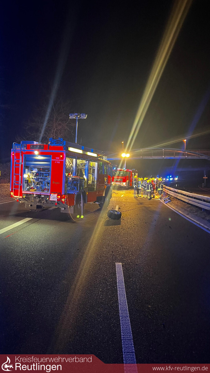 Um 01:46 Uhr am Samstagmorgen wurden Feuerwehr, Rettungsdienst und Polizei zu einem Verkehrsunfall mit Rettung auf die B312 zwischen Eningen und Reutlingen alarmiert. Vor Ort konnte ein verunfallter und stark deformierter PKW vorgefunden werden.