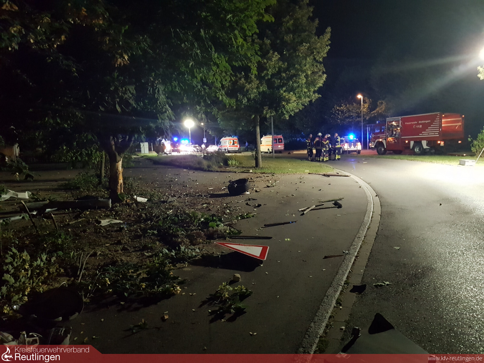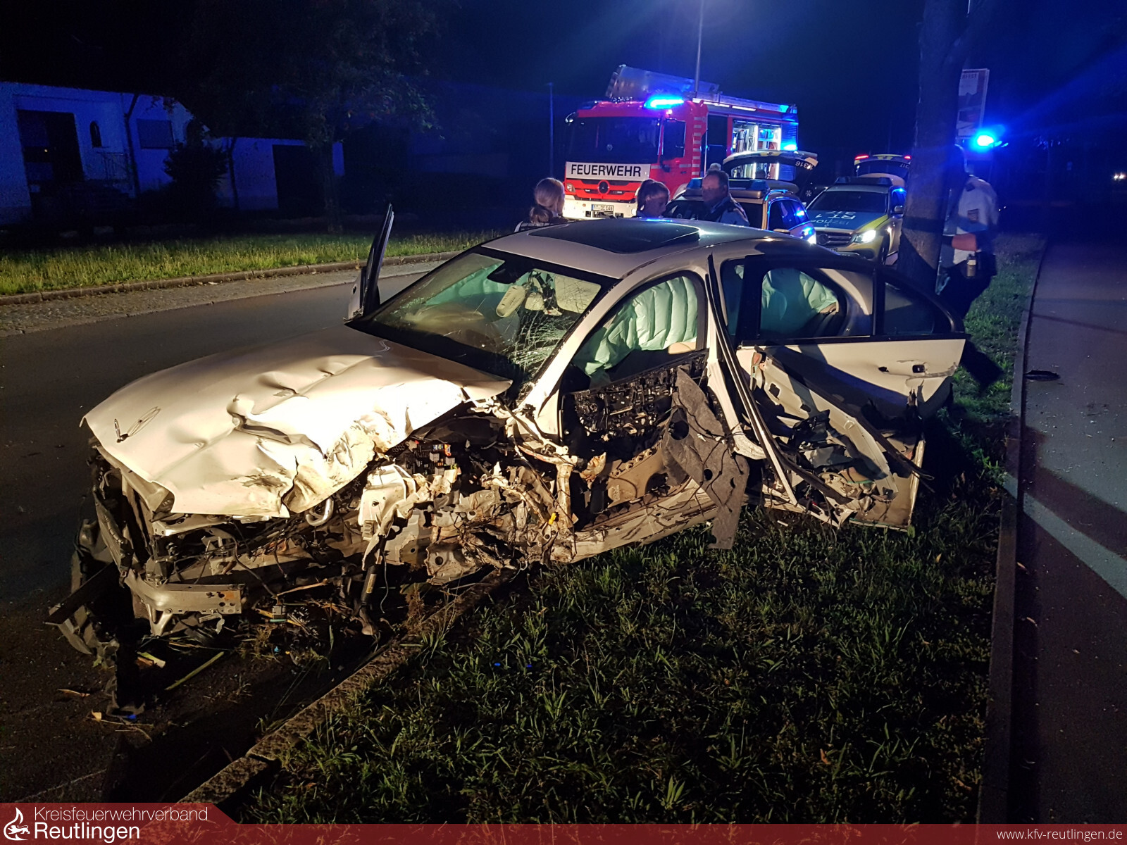 Zwei vermutlich Leichtverletzte und ein Sachschaden mehr als 40.000 Euro sind die Bilanz eines Verkehrsunfalls, der sich am frühen Donnerstagmorgen in der Karlstraße ereignet hat. Den bisherigen Ermittlungen der Verkehrspolizei zufolge, waren ein 29-jähriger Pfullinger und sein 33-jähriger Begleiter gegen 3.30 Uhr mit der Mercedes C-Klasse des Älteren auf der Karlstraße entgegen der Einbahnstraße unterwegs. Weil der Fahrer nicht nur entgegen der vorgeschriebenen Fahrtrichtung, sondern zudem auch mit deutlich überhöhter Geschwindigkeit fuhr, verlor er im Verlauf einer Recht-/Linkskurve an der Einmündung zur Metzinger Straße die Kontrolle über seinen Wagen. Der Mercedes krachte zunächst gegen einen Zaun, überfuhr dann mehrere Verkehrszeichen, ein Straßenschild und einen Laternenmast und knallte dann gegen einen Baum. Von diesem Baum wurde das Fahrzeug abgewiesen, schleuderte über eine Wiese und krachte schließlich mit dem Heck voraus in der Metzinger Straße gegen einen weiteren Baum, an dem der Wagen schließlich zum Stehen kam. Beide Fahrzeuginsassen waren deutlich alkoholisiert und wurden nach derzeitigen Erkenntnissen leicht verletzt. Sie wurden nach notärztlicher Erstversorgung vom Rettungsdienst zur Untersuchung ins Krankenhaus gebracht. Nachdem beide widersprüchliche Angaben machten, wer gefahren ist, wurde bei jedem eine Blutentnahme durchgeführt und beide Führerscheine beschlagnahmt. Der völlig zerstörte Mercedes musste von einem Abschleppdienst geborgen werden. Er wurde zur kriminaltechnischen Untersuchung durch die Spezialisten der Verkehrspolizei sichergestellt. (Quelle PP Reutlingen)