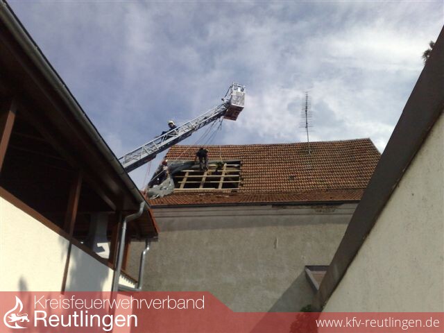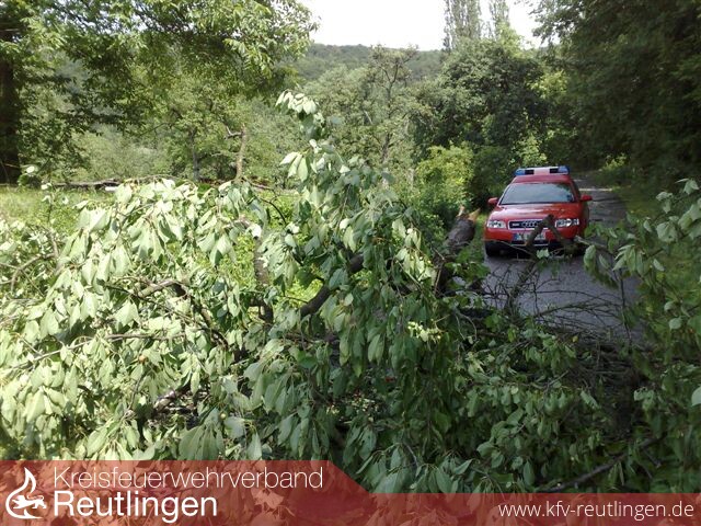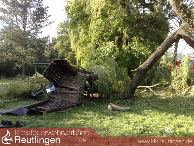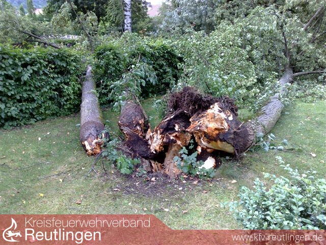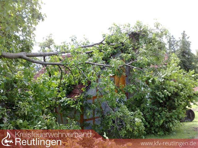Zu insgesamt 23 Einsätzen musste die Feuerwehr Pfullingen am Sonntag Nachmittag ausrücken. Mehrere umgestürzte Bäume, abgedeckte Häuser und unpassierbare Straßen mussten abgearbeitet werden. Im Einsatz waren 54 Kräfte der Feuerwehr, sowie Kräfte des städtischen Bauhofs und der Bereitschaftsdienst der Stadtwerke.