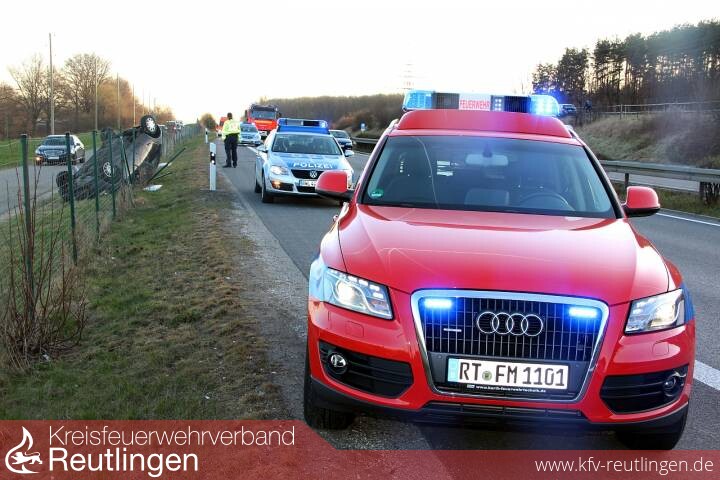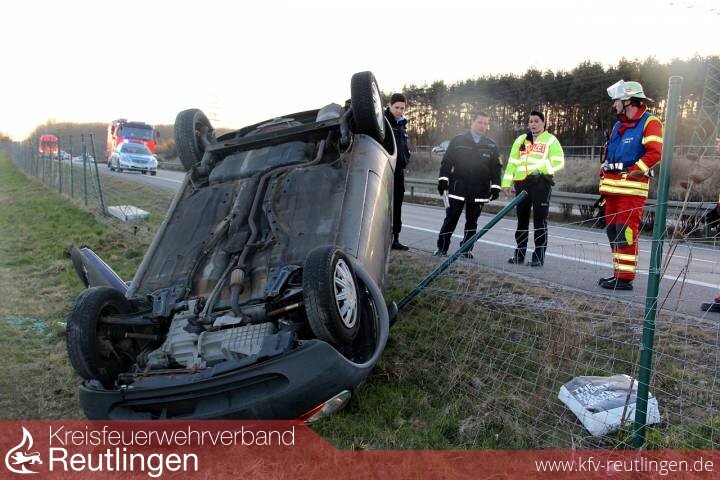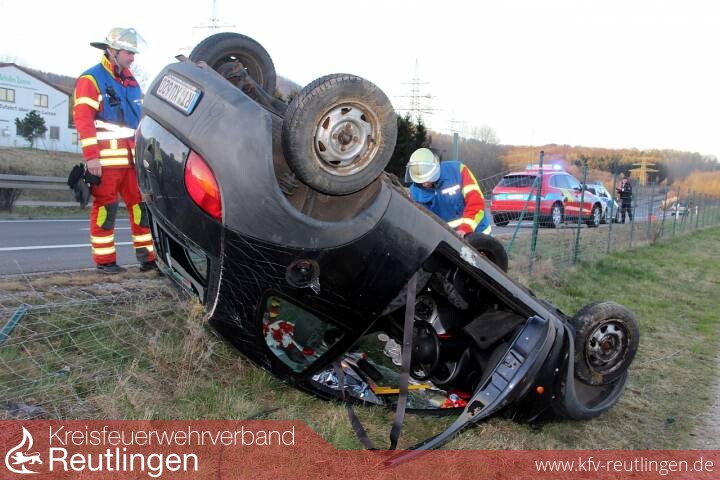 Weil ein Kleinlaster Schalelemente verloren hatte, ist eine Autofahrerin verunglückt. Die 29-Jährige war mit ihrem Ford Ka gegen 7.15 Uhr auf der B 28 von Metzingen in Richtung Reutlingen unterwegs, als sie auf Höhe Achalmlamm wegen der auf der Fahrbahn liegenden Schalteile scharf abbremsen musste. Dabei geriet ihr Ford ins Schleudern, kam nach rechts von der Fahrbahn ab, überschlug sich und blieb letztendlich im Bereich des Grünstreifens auf dem Dach liegen. Die Fahrerin zog sich leichte Verletzungen zu, während sich der an ihrem Ford Ka und an einem Zaun entstandene Sachschaden auf etwa 10.000 Euro belaufen dürfte. Neben dem Rettungsdienst kam auch die Feuerwehr zur technischen Hilfeleistung zum Einsatz. Zum einen musste ausgelaufenes Motorenöl aufgenommen, Erdreich abgetragen, die Einsatzstelle abgesichert und die Fahrbahn gereinigt werden. Die verletzte Autofahrerin konnte noch vor Eintreffen der Feuerwehr von der Polizei aus dem Auto befreit werden.