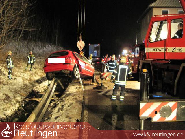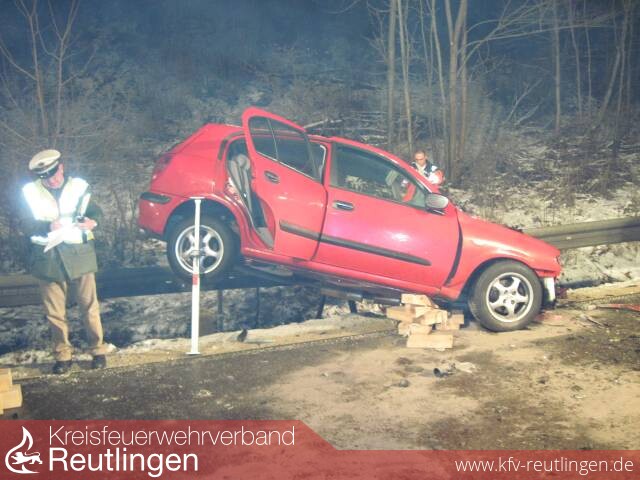 Der PKW wurde aus der instabilen Lage auf der Leitplanke angehoben und auf der Straße abgelassen. Danach konnte der Fahrer von den Einsatzkräften der Freiw Feuerwehr Bad Urach geborgen werden.