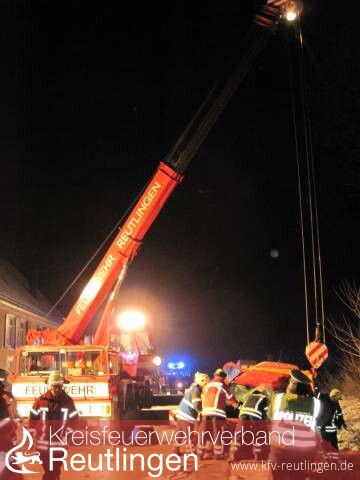 Der inzwischen in Bad Urach in Bereitstellung stehende Rüstzug „Kran“ der Reutlinger Berufsfeuerwehr wurde nach Absprache mit dem Einsatzleiter zur Einsatzstelle vorgezogen und die Bergung des Fahrzeuges eingeleitet.