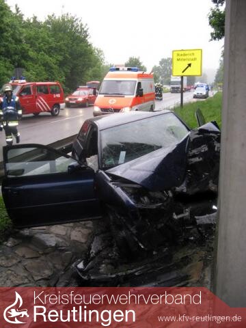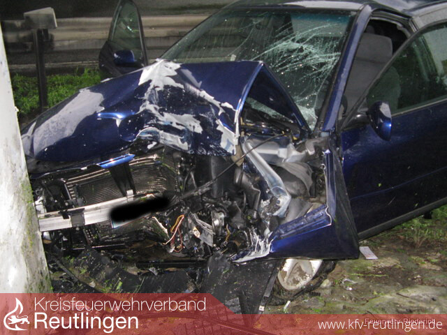 Entgegen ersten Meldungen war der schwer verletzte Fahrer nicht eingeklemmt und beim Eintreffen der Feuerwehr bereits von Ersthelfern aus dem Auto befreit. Der VRW aus Metzingen konnte daher die Anfahrt abbrechen. Bis zum Eintreffen von Rettungsdienst und Notarzt übernahm die Feuerwehr zusammen mit dem Helfer vor Ort des DRK Metzingen die Erstversorgung.