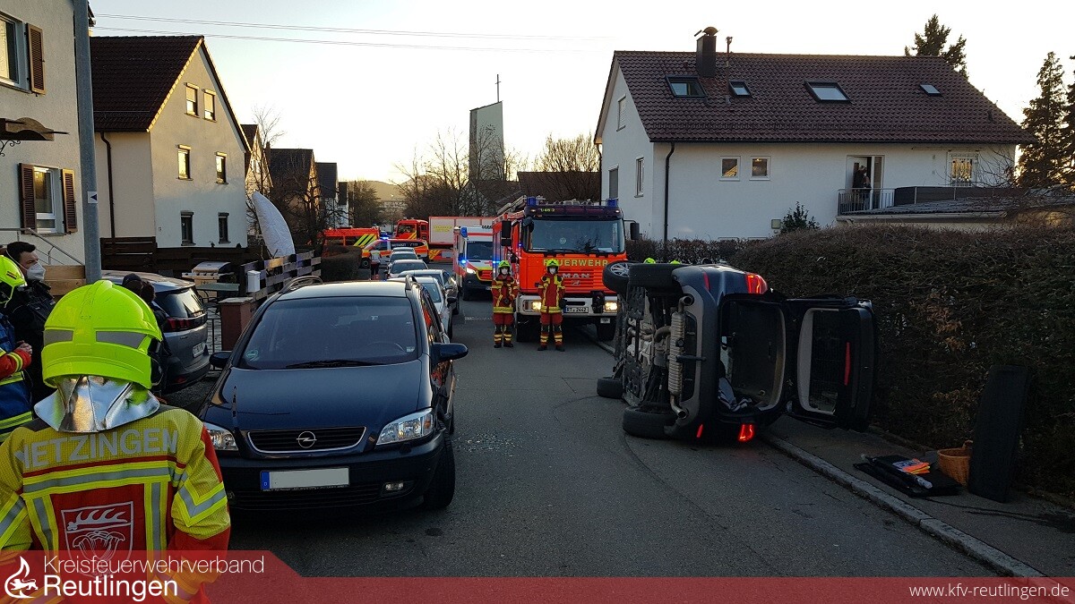 Gegen 16:30 Uhr alarmierte die Integrierte Leitstelle in Reutlingen die Feuerwehr Metzingen mit dem Stichwort „Verkehrsunfall schwer“. Im Wohngebiet Ösch touchierte ein BMW SUV ein am Straßenrand geparktes Fahrzeug. In Folge des Zusammenstoßes kippte der Unfallverursacher mit seinem Fahrzeug ein paar Meter weiter auf die Seite. Aufgrund zahlreicher Notrufe und die Unklarheit, ob sich noch Personen in dem Fahrzeug aufhalten, wurde eine Stichworterhöhung durchgeführt und weitere Einheiten alarmiert.