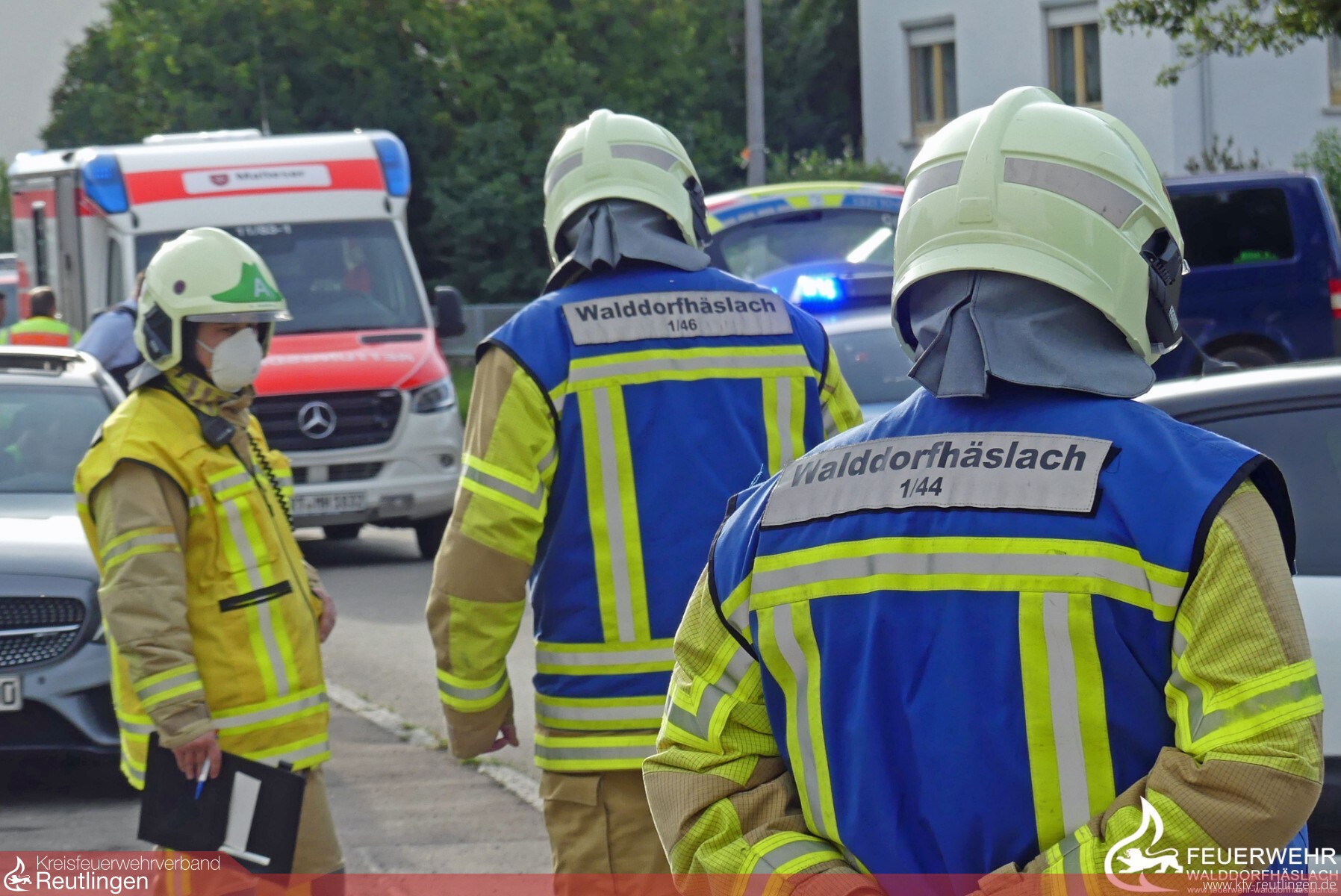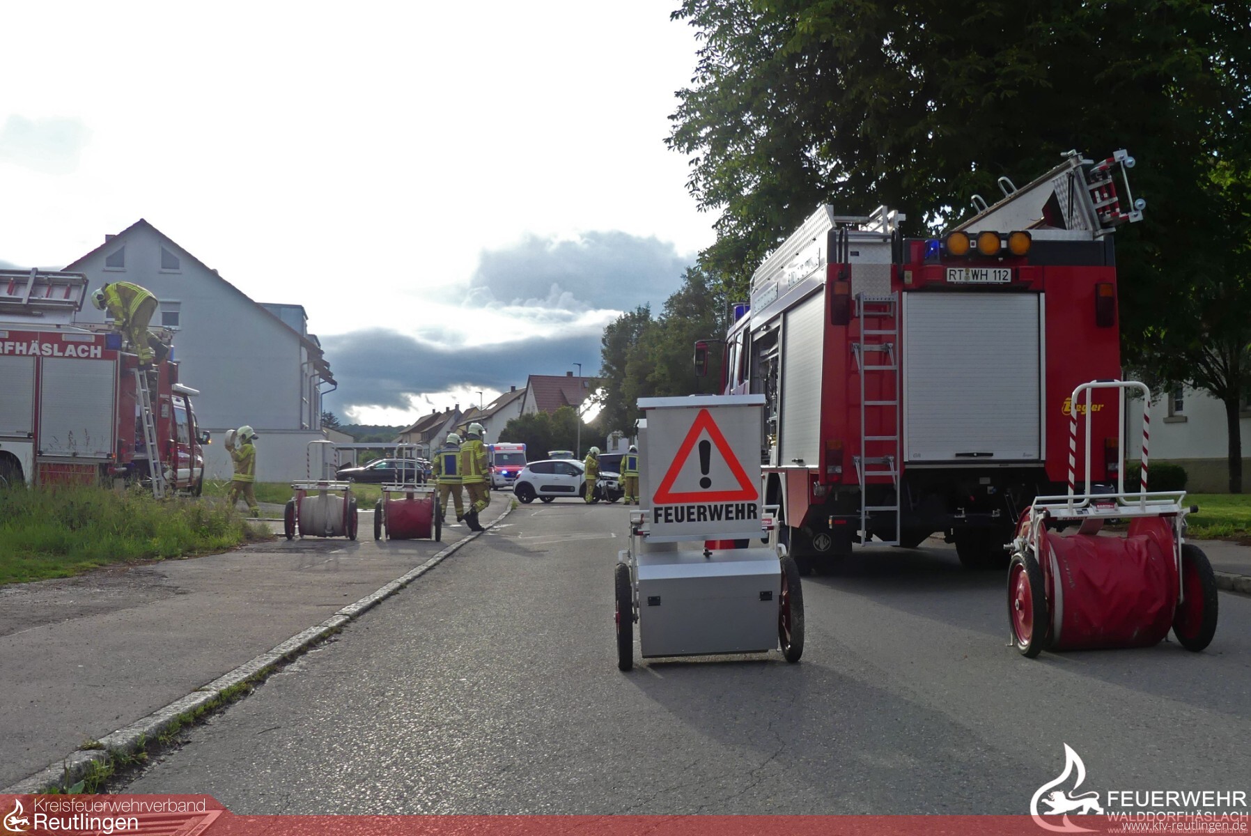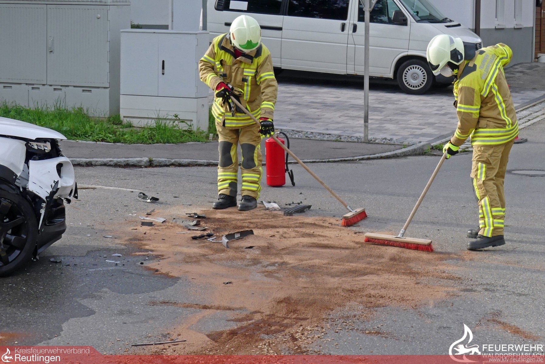 Am Freitagabend wurde die Feuerwehr Walddorfhäslach zu einem Verkehrsunfall in den Ortsteil Walddorf alarmiert. Nach einer schnellen Ausrückzeit von nur 3 Minuten, konnte bereits nach 5 Minuten die erste Lagemeldung vor Ort durch den Einsatzleitwagen abgegeben werden. An der Unfallstelle waren zwei PKWs zusammengestoßen. Alle Beteiligten Personen verließen die Autos gemeinsam mit Ersthelfern. Bis zum Eintreffen des Rettungsdienstes und des Notarztwagens aus Reutlingen betreuten wir die verunfallten Personen. Ebenfalls sicherten wir gemeinsam mit der Polizei die Straße mit zwei Fahrzeugen und stellten den Brandschutz mit einem Strahlrohr sicher. Nachdem die Fahrzeuge abgeschleppt wurden, reinigten wir die Straße vor Ölflecken und ausgelaufenen Betriebsstoffen. Nach Absprache mit der Polizei wurden Ölspurschilder an die Unfallstelle gebracht und dort aufgestellt.