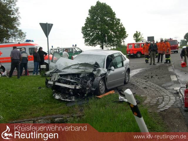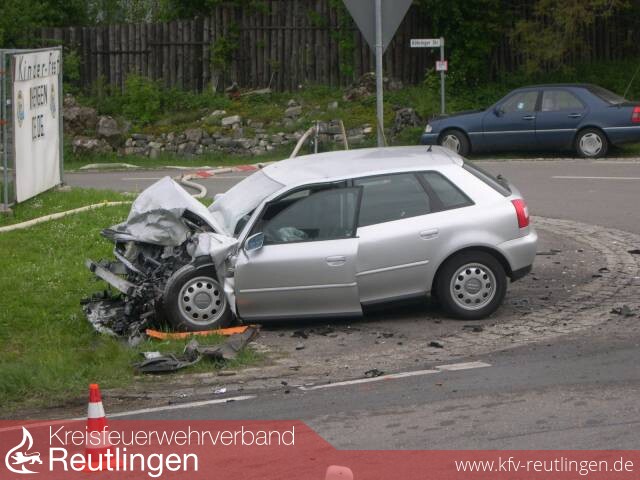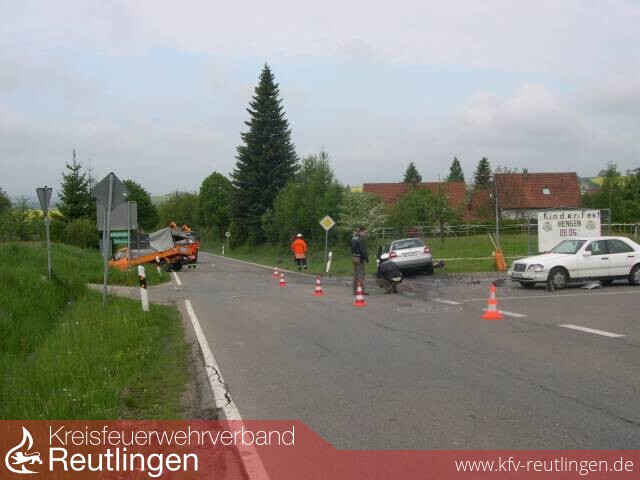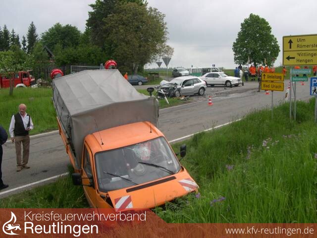 Am heutigen Morgen wurde die Feuerwehr Bad Urach mit dem Rüstzug und den Abt. Hengen und Wittlingen zu einem Verkehrsunfall mit eingeklemmter Person alarmiert. Der Unfall ereignete sich auf der K6706 zwischen Hengen und Seeburg genau an der Ortseinfahrt Hengen. Ein Kleintransporter der Straßenmeisterei aus Seeburg kommend wollte vermutlich nach links in Richtung Hengen abbiegen, dabei übersah er einen aus Richtung Böhringen kommenden Audi A3. Die beiden Fahrzeuge kollidierten fast Frontal, durch die Wucht, wurde der Transporter einige Meter weiter in den Straßengraben geschleudert. Der Audi rutschte über die Kreuzung, wobei er noch einen Mercedes touchierte und diesen leicht beschädigte. Als das erste Fahrzeug, das TSF der Abt. Hengen, an der Einsatzstelle eintraf, stellte sich zum Glück heraus, dass niemand mehr in den Fahrzeugen eingeklemmt war. Die beiden jungen Frauen im Audi und der Fahrer des Transporters wurden von der Feuerwehr bis zum Eintreffen des DRK versorgt. Sie kamen mit mittleren bis schweren Verletzungen in verschiedene Kliniken. Nachdem die Unfallaufnahme abgeschlossen war und die Fahrzeuge abgeschleppt, wurde noch die Fahrbahn gereinigt. Im Einsatz waren der Rüstzug aus Bad Urach mit den Abteilungen Hengen und Wittlingen.