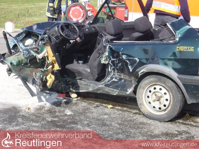Die Fahrerin wurde in Absprache mit dem DRK Patientengerecht aus ihrem Wrack befreit. Dazu musste das Dach abgetrennt und der Vorderwagen mit Hilfe von hydraulischem Zylinder weggedrückt werden.