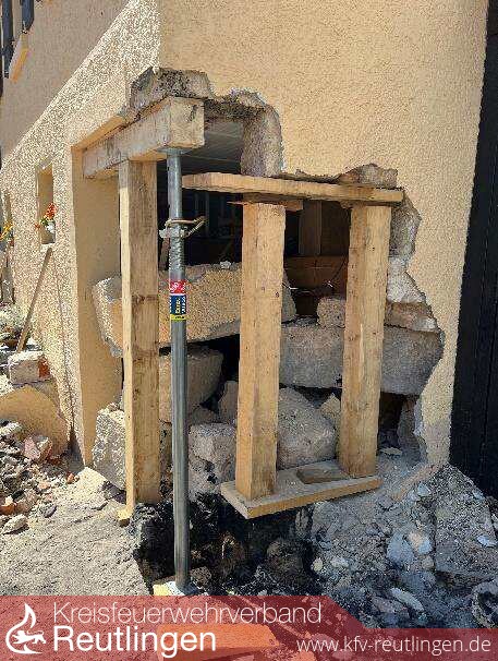 Nach dem die Rettung der Verletzten abgeschlossen und die Unfallaufnahme durch die Polizei beendet war, begann die Feuerwehr mit der Sicherung des Gebäudes. Durch den Aufprall war ein erheblicher Teil des Tragwerks aus dem Haus gebrochen. Die Mauer wurde fachgerecht abgestützt und die Hauswand verschlossen.