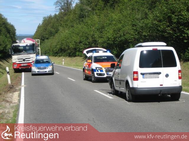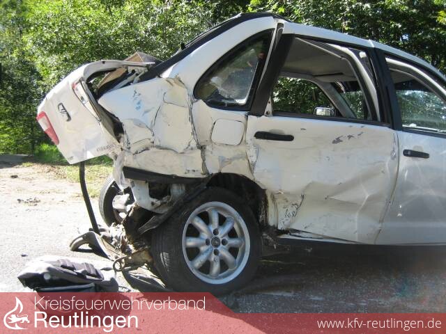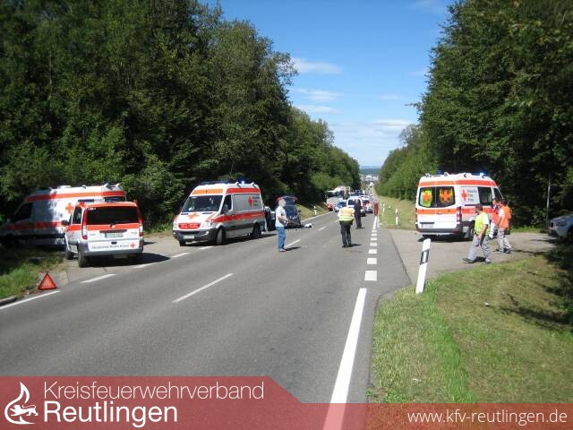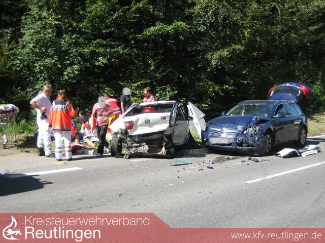 Zu einem schweren Verkehrsunfall mit insgesamt 5 Verletzten kam es heute gegen 14:30 Uhr auf der K 6714 zwischen Metzingen und Eningen, kurz nach dem Forsthof. Ein in Richtung Metzingen fahrender PKW wollte nach links in einen Waldweg einbiegen und hielt daraufhin an. Ein zweites Fahrzeug bemerkte den stehenden PKW zu spät und fuhr frontal in das Heck des Seat. Der Seat wurde bei dem Aufprall auf einen entgegenkommenden Opel geschleudert. Alle Insassen wurden dabei leicht bis schwer verletzt. Im Zuge der Aufräumarbeiten blieb die Kreisstraße 6714 etwa 1 ½ Stunden voll gesperrt. Neben der Feuerwehr Metzingen, die als sogenannte First Responder im Einsatz waren, waren das Polizeirevier Metzingen mit zwei Streifenwagen und der Rettungsdienst mit drei Rettungswagen und einem Notarzteinsatzfahrzeug im Einsatz.