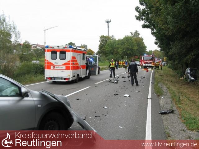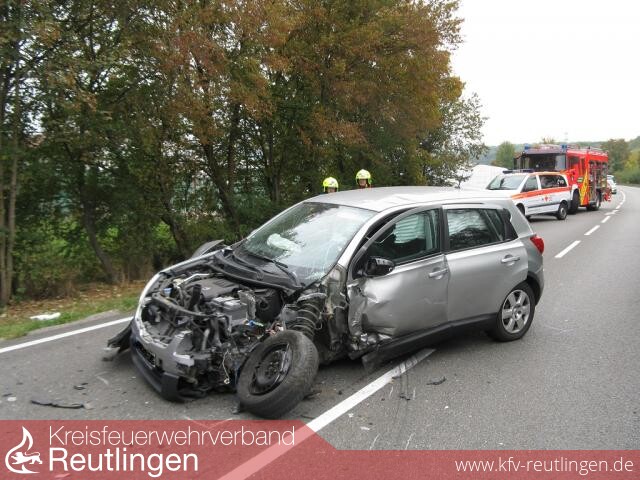 Der Unfall ereignete sich kurz nach 14 Uhr kurz vor der Ausfahrt Riederich. Zu dieser Zeit war ein 46-Jähriger aus dem Landkreis Ludwigsburg mit seinem Nissan auf der Fahrt in Richtung Reutlingen. Aus bislang ungeklärter Ursache geriet er mit seinem Pkw auf die Gegenfahrbahn, wo er frontal mit dem VW Polo der 62-Jährigen kollidierte. Der VW kam von der Straße ab und prallte danach noch gegen einen Baum. Die Frau wurde in ihrem Wagen eingeklemmt und musste von der Feuerwehr befreit werden. Trotz durchgeführter Reanimationsmaßnahmen erlag sie noch an der Unfallstelle ihren schweren Verletzungen. Der schwer verletzte Unfallverursacher und seine ebenfalls verletzte, 38-jährige Beifahrerin wurden vom Rettungsdienst in ein Krankenhaus gebracht. Ein 24-jähriger Fahrer eines Opel Astra aus dem Landkreis Esslingen, der hinter dem VW Polo in Richtung Bempflingen fuhr und den kollidierten Fahrzeugen ausweichen musste, kam im Grünstreifen zum Stehen. Der Opel wurde durch umherfliegende Fahrzeugteile beschädigt. Der Fahrer blieb unverletzt. Der insgesamt entstandene Sachschaden dürfte etwa 20.000 Euro betragen. Alle drei Fahrzeuge wurden abgeschleppt.
