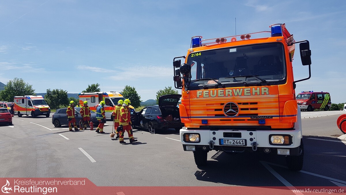 Die Feuerwehr Metzingen wurde am Freitagnachmittag gegen 13 Uhr zur sogenannten „Schlößleskurve“, zwischen Metzingen-Neuhausen und Dettingen/Erms alarmiert. Im Kreuzungsbereich kam es zum Frontalzusammenstoß zweier Fahrzeuge. Insgesamt waren sieben Personen in den zwei Unfallfahrzeugen, eine Person verletzte sich beim Unfall schwer. Die Feuerwehr sichtete die verletzten Personen und übergab sie anschließend dem Rettungsdienst. Parallel wurde die Einsatzstelle gegen den fließenden Verkehr abgesichert, der Brandschutz sichergestellt und die Fahrzeuge auf mögliche Gefahren und austretende Betriebsmittel erkundet. Drei Personen wurden des Weiteren bis zum Eintreffen weiterer Einsatzmittel des Rettungsdienstes betreut. Beide Fahrzeuge waren nicht mehr fahrbereit und mussten abgeschleppt werden. Zwei Personen kamen mit dem Rettungsdienst zur weiteren Untersuchung bzw. Behandlung in ein Krankenhaus.