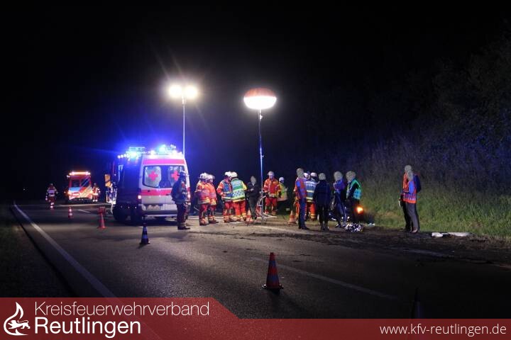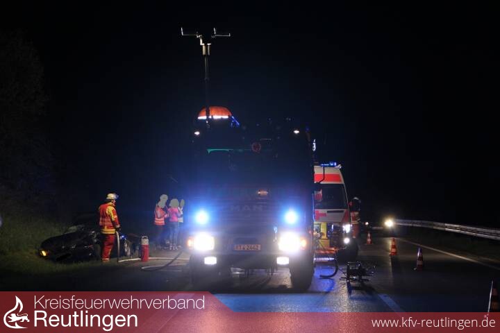Ein Sportwagen, mit zwei 19 Jahre alte Männer besetzt, kam vermutlich wegen überhöhter Geschwindigkeit auf der B 28 zwischen Metzingen und Reutlingen von der Fahrbahn ab und überschlug sich. Die beiden Fahrer wurden dabei zum Teil erheblich verletzt. Bei den ersten Notrufen wurden eingeklemmte Personen gemeldet. Dies bestätigte sich zum Glück nicht. Die Feuerwehr sicherte die Einsatzstelle ab, stellte den Brandschutz sicher und leuchtete die Einsatzstelle aus. Nach Ende der Unfallaufnahme wurden Unfallteilen und Erde von der Straße entfernt und die Fahrbahn gereinigt.