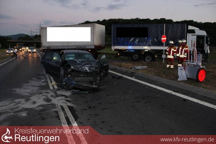 Am Freitagabend kam es zu einem folgenschweren Unfall auf der B312 höhe Metzingen. Eine Ford-Fahrerin bog von der Hexam-Allee auf die B 312 in Fahrtrichtung Reutlingen ein. Dabei geriet sie auf die Gegenfahrbahn und kollidierte frontal mit einem ordnungsgemäß entgegenkommenden Lkw. Bei dem heftigen Aufprall wurde die Frau zum Glück nicht in ihrem Fahrzeug eingeklemmt und konnte vom Rettungsdienst schwer verletzt aus ihrem Fahrzeug gerettet werden. Der Lkw-Fahrer und seien Beifahrerin blieben unverletzt. Da bei beiden Fahrzeugen Betriebsmittel ausliefen, wurde die Feuerwehr Metzingen zur Hilfeleistung nach Verkehrsunfall alarmiert. Die Feuerwehr unterstützte die Polizei bei der Einsatzstellenabsicherung, streute ausgelaufene Betriebsmittel ab, leuchte die Einsatzstelle aus und unterstützte die Verkehrspolizei aus Tübingen bei ihrer Unfallaufnahme. Nach den Untersuchungen musste die Fahrbahn durch eine Spezialfirma gereinigt werden. Die B 312 war bis etwa 24 Uhr voll gesperrt.