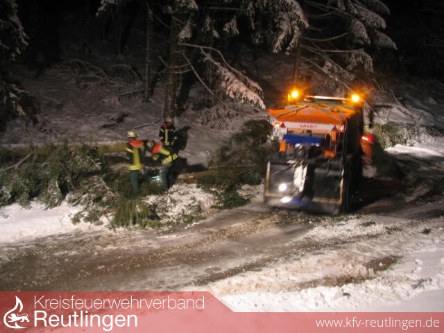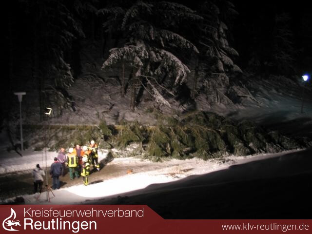 Am Mittwoch, den 06.02.2013 um 20.12 Uhr musste die Feuerwehr Sonnenbühl zu einer Baumbeseitigung ausrücken. Auf dem Hardtweg wurde ein in Richtung Erpfingen fahrender PKW von einer umstürzenden Fichte erfasst. Glücklicherweise wurde der Fahrer nicht verletzt. Am PKW wurde die Windschutzscheibe und das Dach beschädigt. Der umgestürzte Baum wurde mit der Motorsäge zerlegt und von der Straße beseitigt. Im Einsatz war die Abteilung Erpfingen mit 13 Mann.