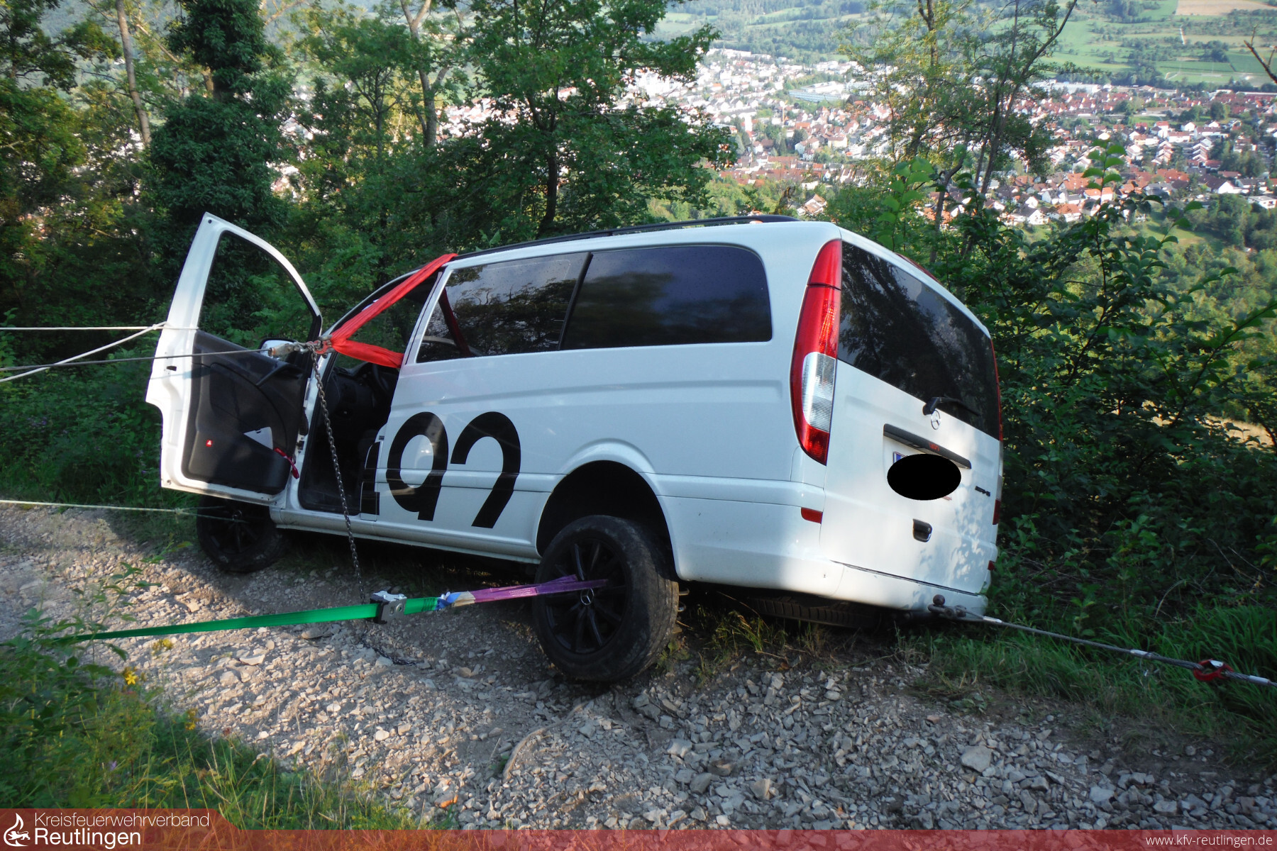 Nachdem der erste Schreck verdaut war begannen die Insassen mit Sicherungsmaßnahmen. Aufgrund der Vorbereitungen für eine „Schnitzeljagd“ hatten sie Spanngurte im Fahrzeug und nutzen diese um das Fahrzeug vor dem Absturz zu sichern.