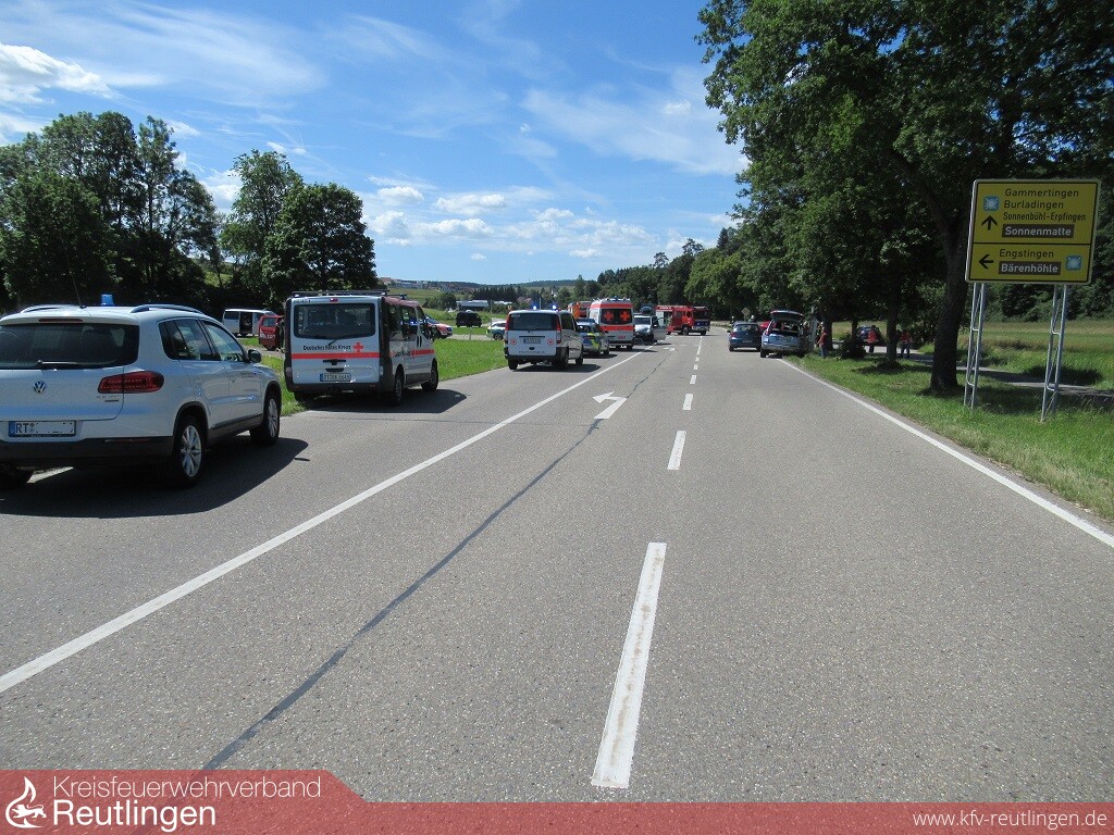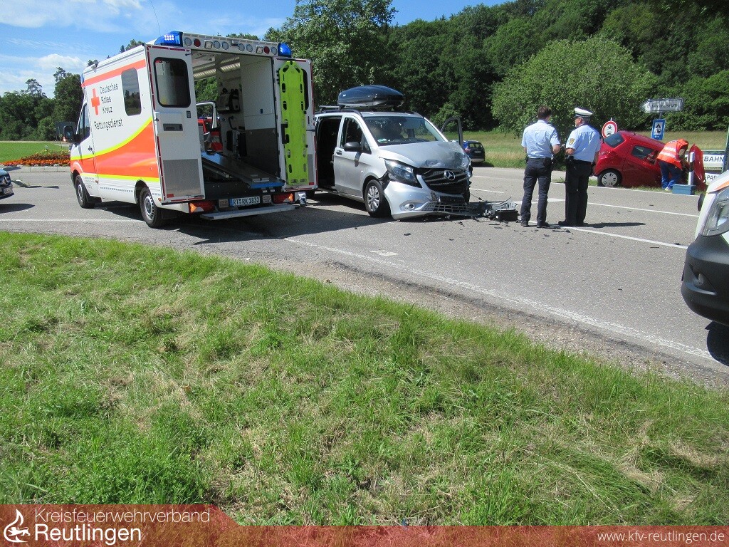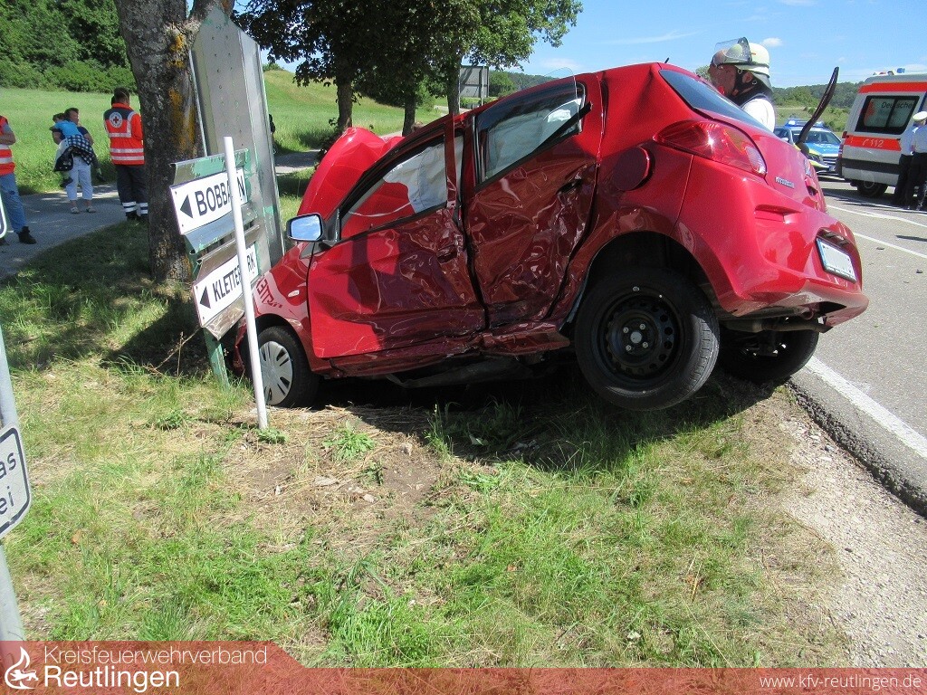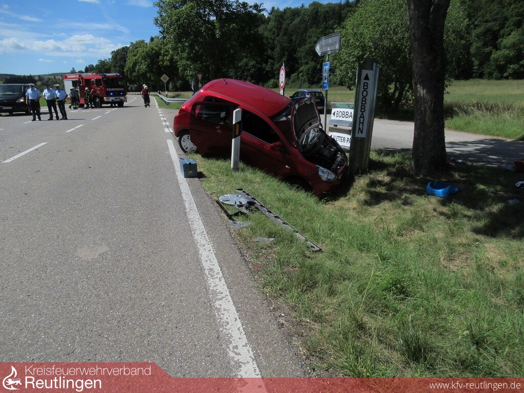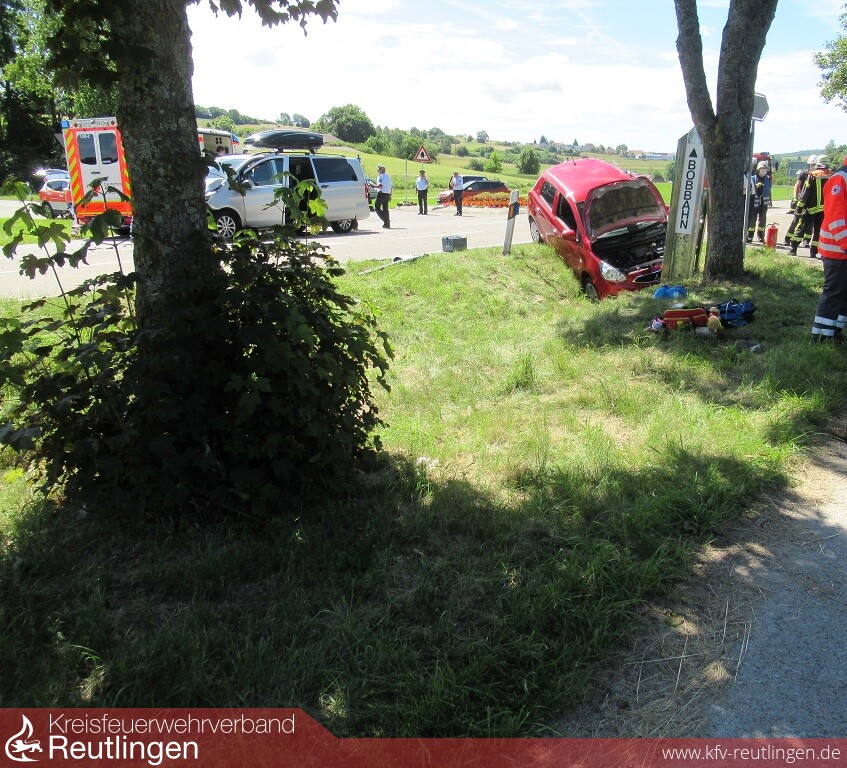 Mehrere Verletzte und ein Sachschaden von etwa 11.000 Euro sind die Bilanz eines Verkehrsunfalls, der sich am Donnerstagvormittag an der Einmündung L 382/ K 6767 ereignet hat. Kurz vor elf Uhr war die 43-jährige Lenkerin eines Mitsubishi Space Star auf der K 6767 in Richtung L 382 unterwegs. An der dortigen Einmündung missachtete sie die Vorfahrt eines in Richtung Undingen fahrenden 34-Jährigen in einem Mercedes Vito und bog nach links ab. Durch die anschließende Kollision wurde der Mitsubishi in den gegenüberliegenden Straßengraben abgewiesen und kam an einem Hinweisschild zum Stehen. Die 43-Jährige wurde dabei so schwer verletzt, dass sie von einem Rettungshubschrauber in eine Klinik geflogen werden musste. Ihr fünfjähriger, im Auto mitfahrender Sohn blieb nach derzeitigem Kenntnisstand unverletzt. Der 34-jährige Vito-Fahrer blieb ersten Erkenntnissen zufolge ebenfalls unverletzt. Seine 33 Jahre alte Beifahrerin wurde, wie drei Kinder, die sich zur Unfallzeit im Fond des Fahrzeugs befunden hatten, vorsorglich vom Rettungsdienst in eine Klinik gebracht. Beide Fahrzeuge waren nicht mehr fahrbereit. Sie wurden von einem Abschleppunternehmen aufgeladen und abtransportiert. Die L 382 musste für Bergungsarbeiten und die Unfallaufnahme bis etwa 13 Uhr voll gesperrt und der Verkehr örtlich umgeleitet werden. Die Feuerwehr war mit fünf Fahrzeugen und 40 Feuerwehrleuten im Einsatz.