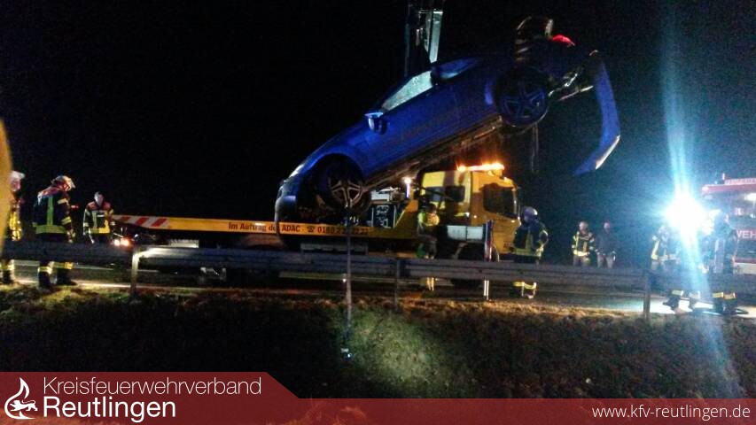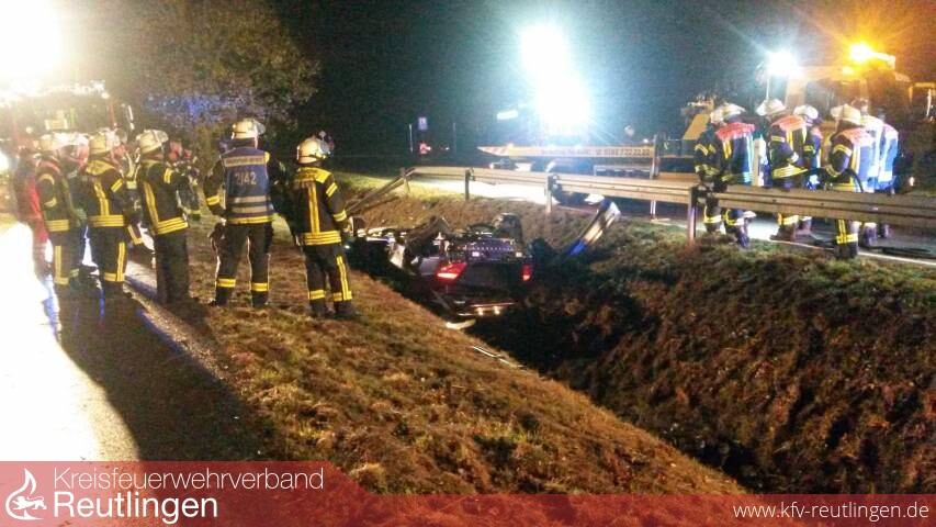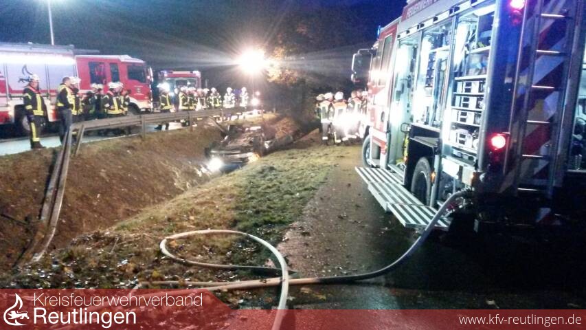Am frühen Montagmorgen kam es auf der L382 zwischen Sonnenbühl-Undingen und Sonnenbühl-Erpfingen an der Kreuzung Richtung Haid zu einem schweren Verkehrsunfall. Der Fahrer eines relativ Neuen Mercedes AMG kam aus Richtung Engstingen kommend infolge nicht angepasster Fahrweise beim Abbiegen auf regennasser Fahrbahn ins Schleudern. Er prallte gegen die Leitplanke ,überschlug sich der Länge nach und kam dann mit dem Dach nach unten im Strassengraben zum liegen. Durch das Alarmstichwort H3/ Personen eingeklemmt wurden alle Sonnenbühler Abteilungen ,sowie der Engstinger VRW alarmiert. Der leicht verletzte Fahrer konnte mit pneumatischem- und hytraulischen Rettungsgerät befreit ,und dem anwesenden Rettungsdienst übergeben werden . Sonst waren keine Personen mehr im Unfall PKW. Stellv.KBM Hartmut Holder machte sich am Unfallort ebenfalls ein Bild der Lage. Die Feuerwehr unterstützte die Bergung des Fahrzeugs und leuchtete die Unfallstelle großflächig aus. Nach rund 2 Stunden konnte die Fahrbahn pünktlich zu Beginn des Berufsverkehrs wieder durch die Polizei freigegeben werden.