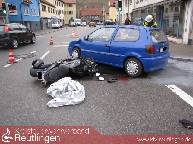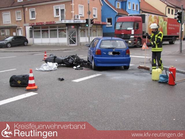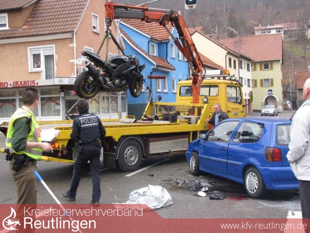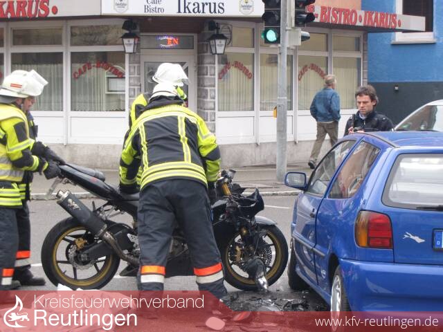 Zu einem Verkehrsunfall in der Holzelfinger Straße Kreuzung Moltke,- Kirchstraße wurde die Feuerwehr Lichtenstein Abt. Unterhausen alarmiert. Ein Motorrad prallte frontal mit einem PKW zusammen. Der Motorradfahrer kam mit Verletzungen in das Klinikum nach Reutlingen. An den Fahrzeugen entstand ein hoher Sachschaden.