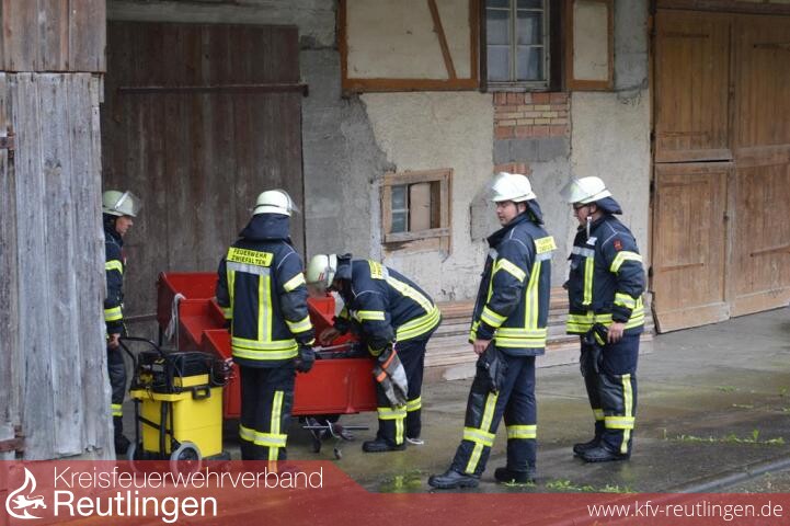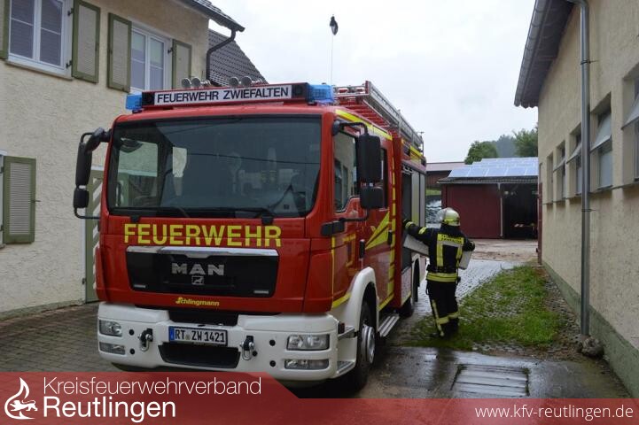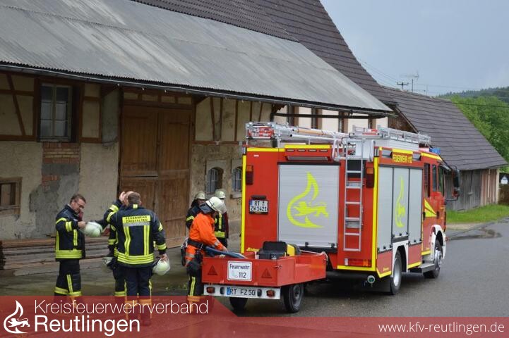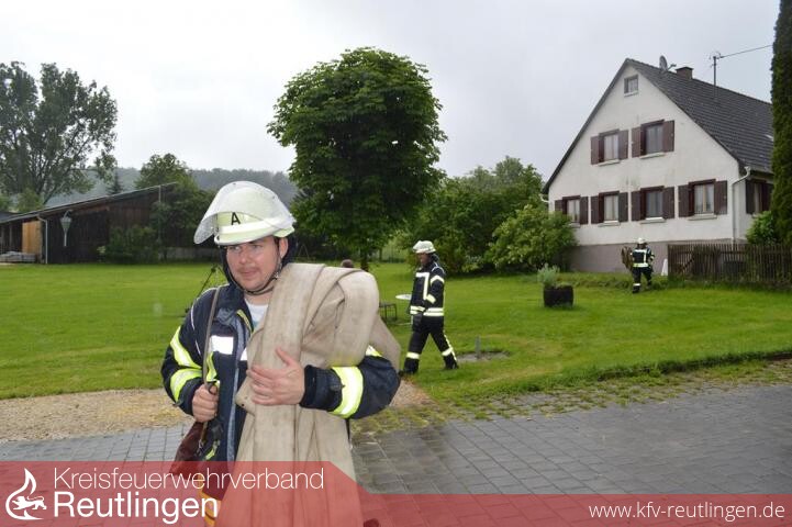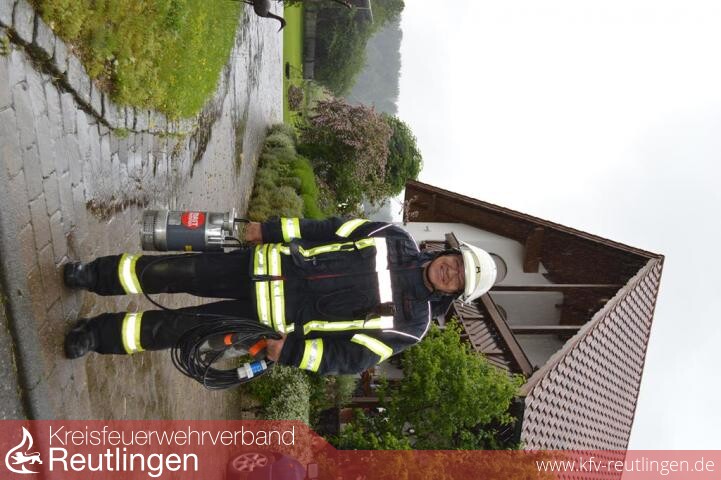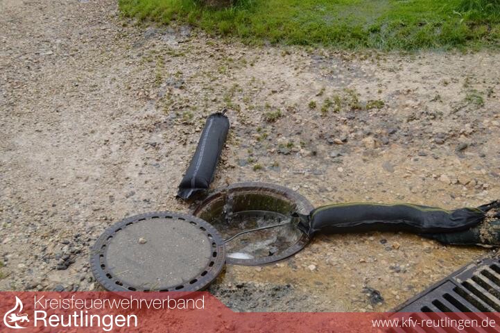Nach einem Starkregen von ca. 30l/qm innerhalb einer viertel Stunde durchflossen die Wassermassen den Teilort Mörsingen. An einer Hanglage kam soviel Wasser zusammen, dass diese im Ort die Ablaufschächte nicht mehr aufnehmen konnten und so in drei Gebäude eindrang.